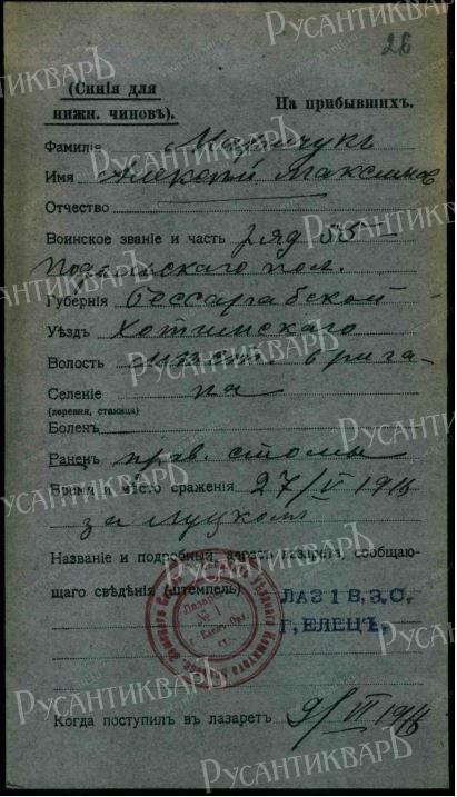 Награждён Марийчук Алексей Максимович 55 пех. Подольский полк, рядовой. 23 мая 1916 г. в бою у фол. Константиновка при наступлении на неприятельские окопы первым двинулся вперед к неприятельским заграждениям, но из-за ранения не дошел до них.