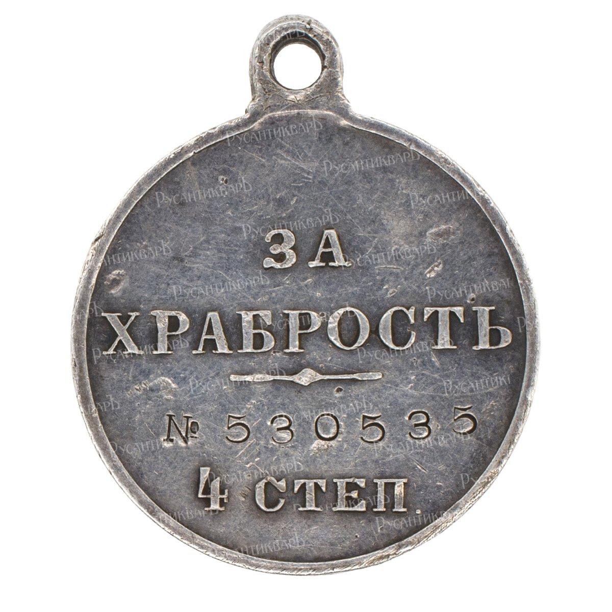 Учреждена в 1807 г во время царствования Императора Александра I (12 марта 1801 - 19 ноября 1825 гг) первоначально без степени и называлась "За ХРАБРОСТЬ". СПб Монетный двор, 1914 г, медальер Антон Фёдорович Васютинский (17 января 1858 - 2 декабря 1935 гг), без подписи. Серебро, 15.03 гр Диаметр 28 мм На оборотной стороне пуансоном выбит номер "№ 530.535". Сохранность очень хорошая, (XF). М. Е. Дьяков "Медали Российской Империи" № 1133.10. В. В. Биткин "Сводный каталог медалей России. Наградные медали для ношения" т 2, № 1113. Отчеканено 1. 335.150 экз.