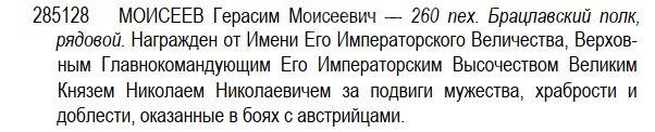 ГК 4 степени № 285128 МОИСЕЕВ Герасим Моисеевич — 260 пех. Брацлавский полк, рядовой. Награжден от Имени Его Императорского Величества, Верховным Главнокомандующим Его Императорским Высочеством Великим Князем Николаем Николаевичем за подвиги мужества, храбрости и доблести, оказанные в боях с австрийцами.