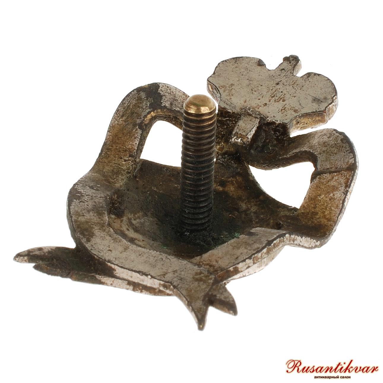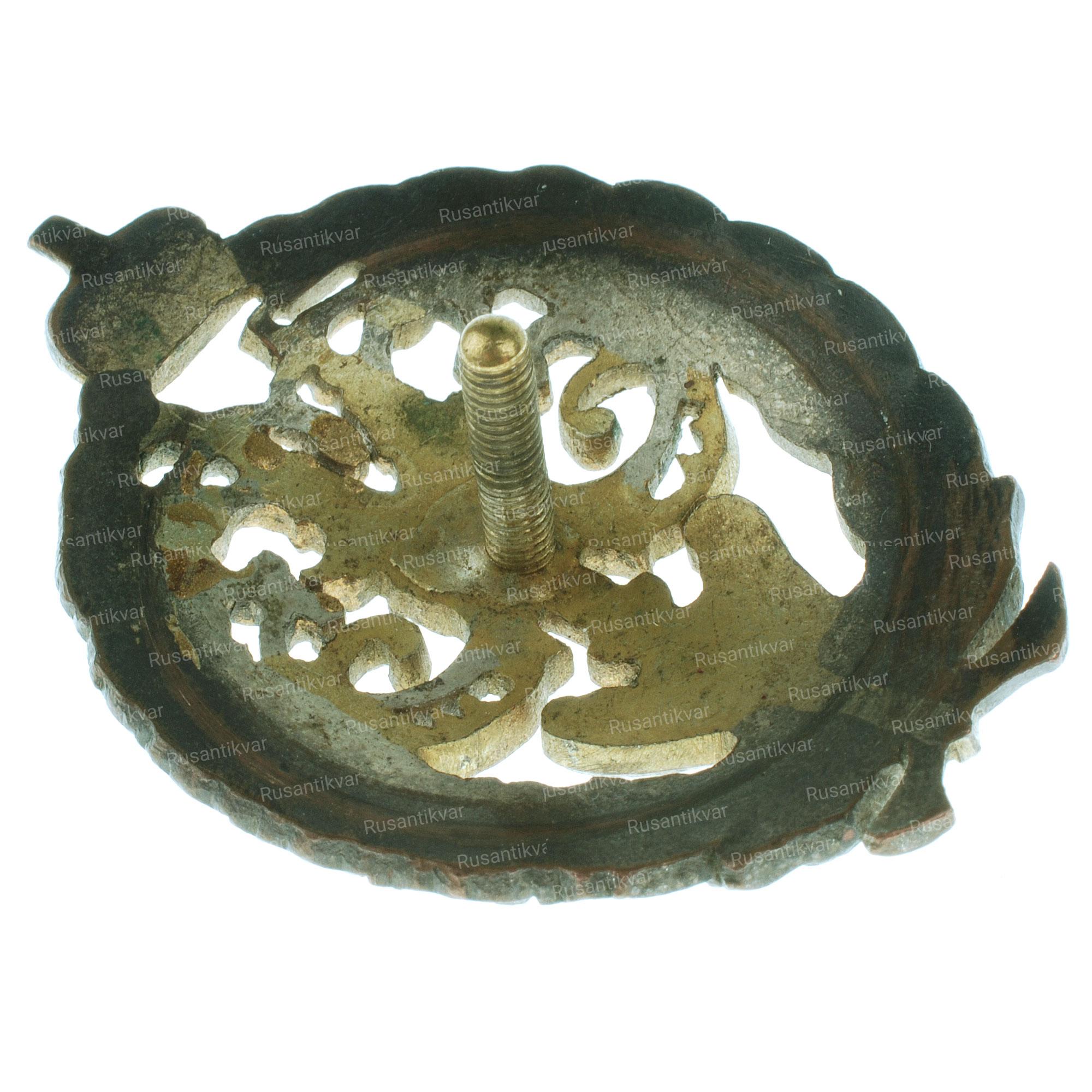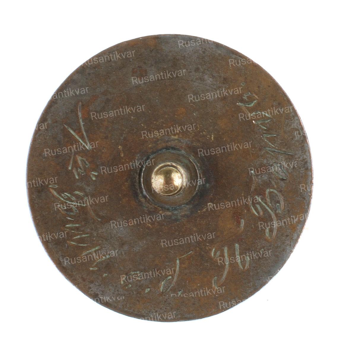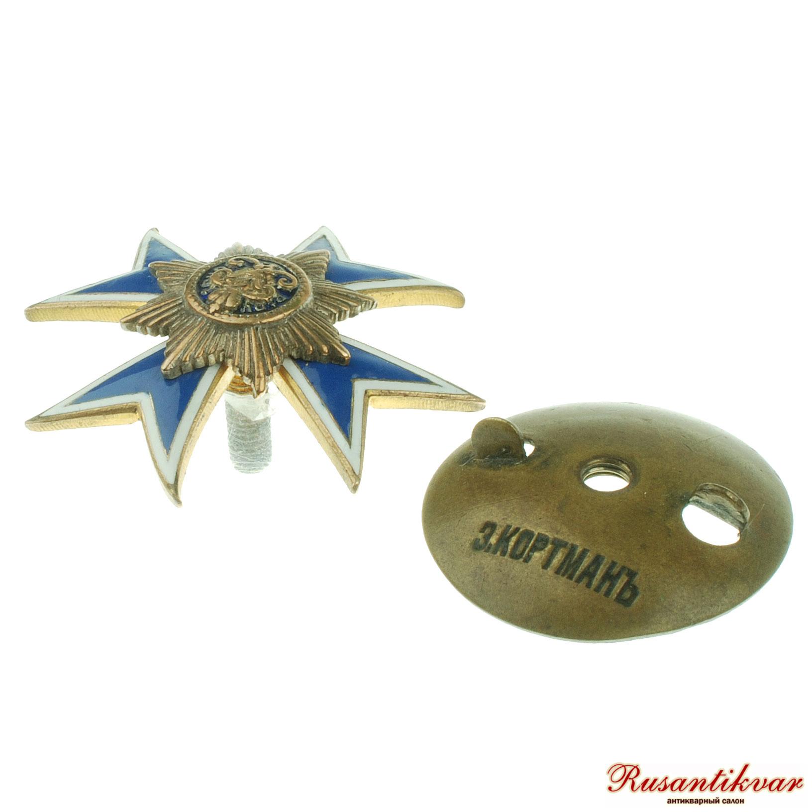 С.-Петербург, 1913–1917 гг. Фирма «Э.Кортман». Клейма: на гайке внизу — клеймо фирмы «Э.КОРТМАНЪ». Бронза, позолота, эмаль. Размеры 42,8×42,6 мм.