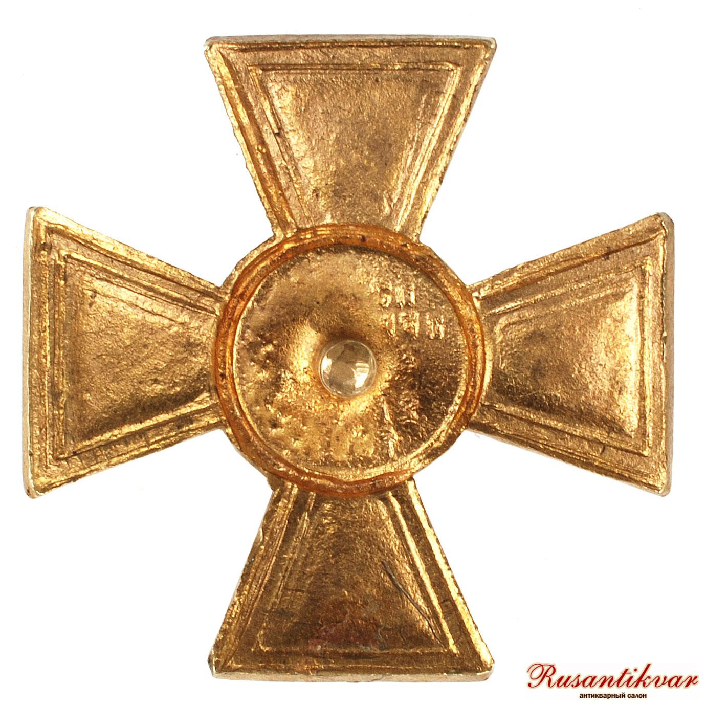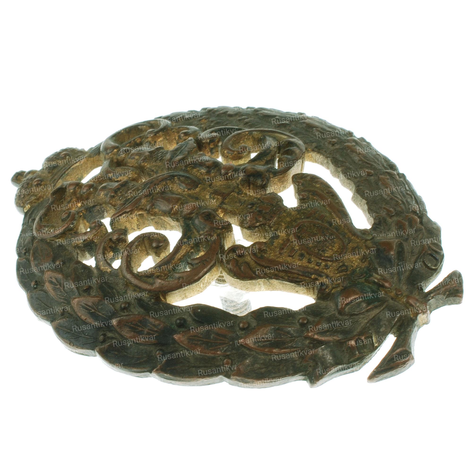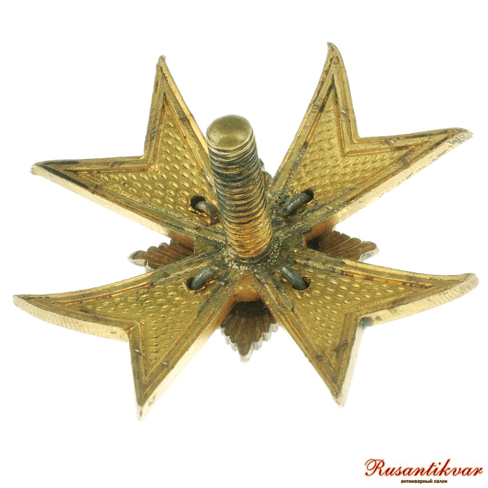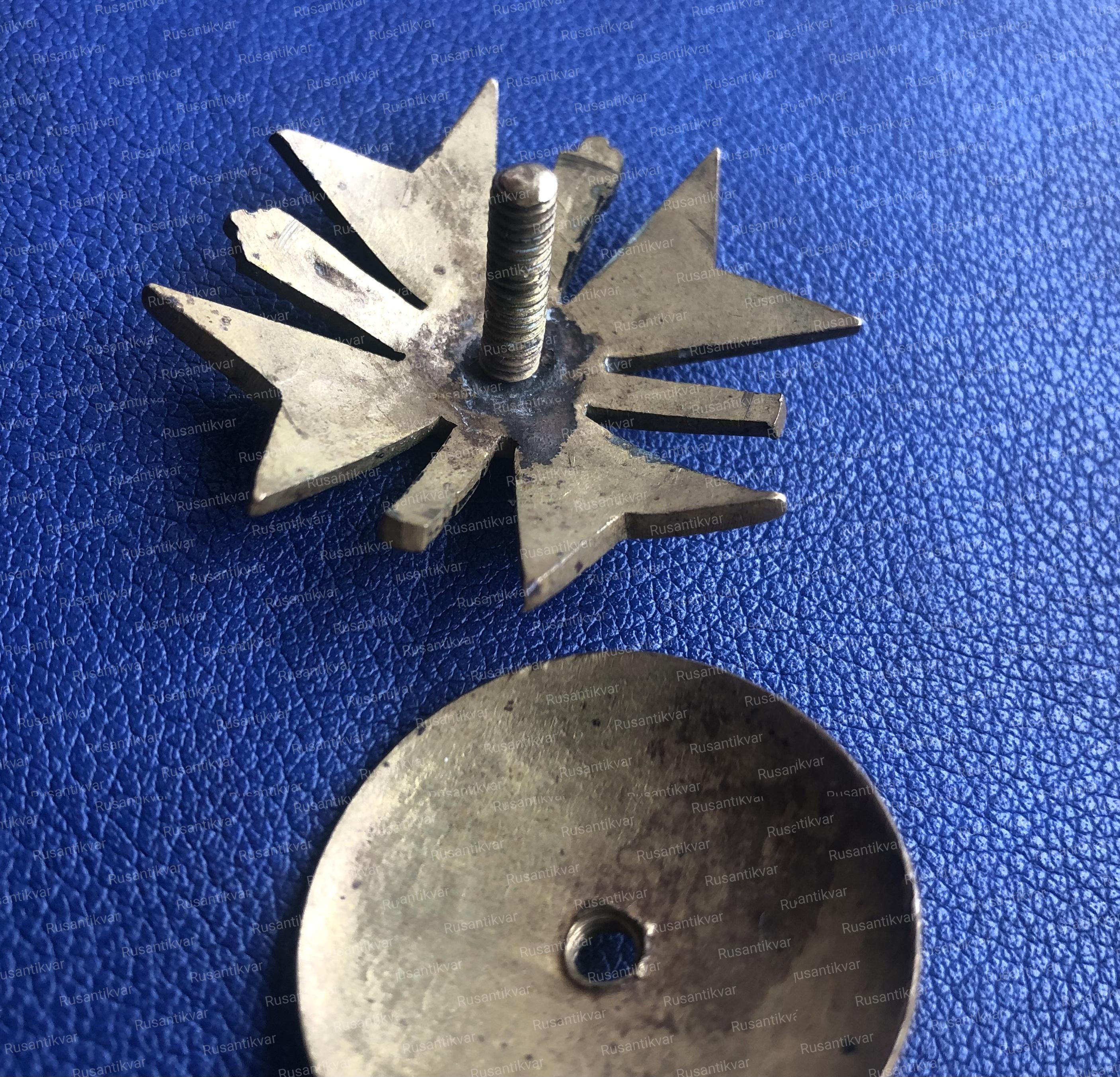 С.-Петербург, 1913–1917 гг. Фирма «Э.Кортман». Клейма: на гайке внизу — клеймо фирмы «Э.КОРТМАНЪ». Бронза, позолота, эмаль. Размеры 42,8×42,6 мм.