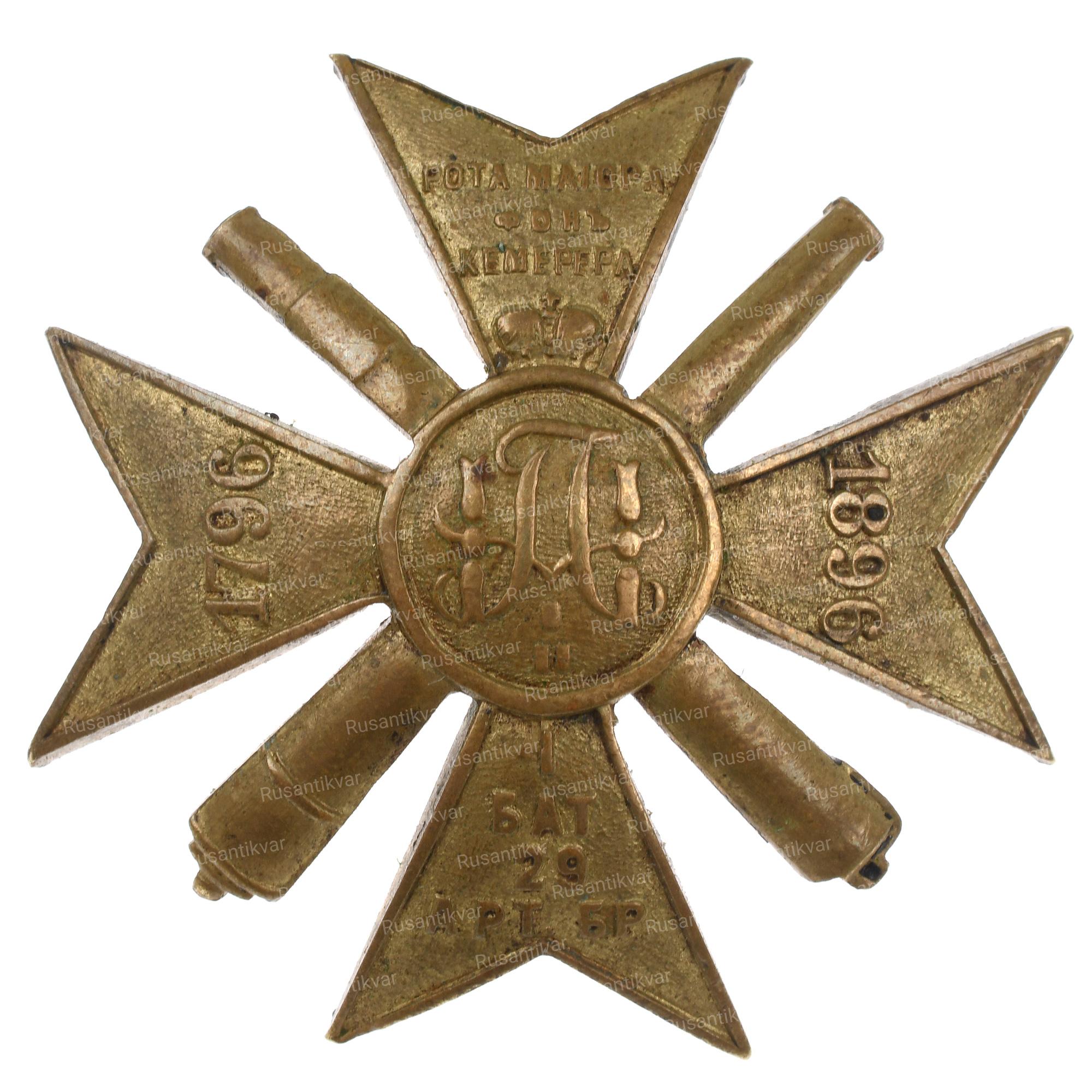 Золотой Мальтийский крест. В центральном золотом медальоне совмещенный золотой вензель Императоров Павла I и Николая II. Медальон увенчан Императорской короной. На горизонтальных лучах креста даты «1796» и «1896». На верхнем луче надпись «РОТА MAIOPA ФОНЪ КЕМЕРЕРА», выполненная в три строки, на нижнем золотая надпись «I БАТ. 29 APT. БР.», выполненная в четыре строки. Между лучами креста скрещенные пушки.