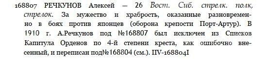 ЗОВО 4 ст.168807 РЕЧКУНОВ Алексей — 26 Вост. Сиб. стрелк. полк, стрелок. За мужество и храбрость, оказанные разновременно в боях против японцев (оборона крепости Порт-Артур). В 1910 г. А.Речкунов под №168807 был исключен из Списков Капитула Орденов по 4-й степени креста, как ошибочно внесенный, и переписан под № 168804 (см.). IIV-1688041