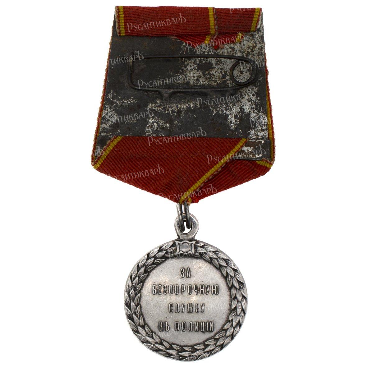 Учреждена 21 декабря 1876 г во время царствования Императора Александра II (18 февраля 1855 - 1 марта 1881 гг). СПб Монетный двор, 1883 г, медальер Леопольд Христианович Штейнман (1848 - 1897 гг) (на аверсе – инициалы медальера "ЛШР" в обрезе шеи, на оборотной стороне в слове "ПОЛИЦIИ" - "I" с точкой, в лавровом венке 25 звеньев). Серебро. Диаметр 34.30 мм. Сохранность очень хорошая (ХF+). М. Е. Дьяков "Медали Российской Империи" № 925.3. В. В. Биткин "Сводный каталог медалей России. Наградные медали для ношения" т. 2, № 1070 (R2). Весьма редкая (Р2).