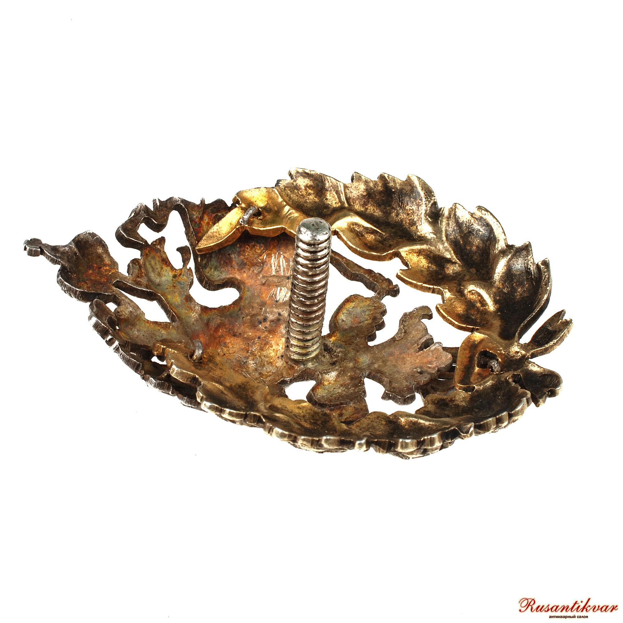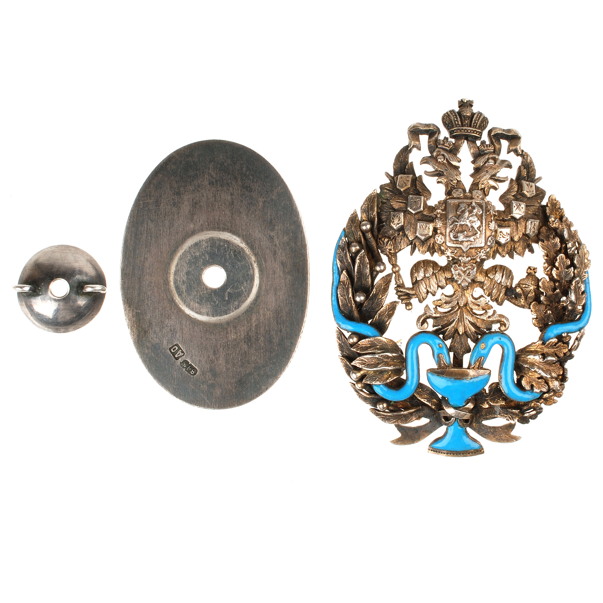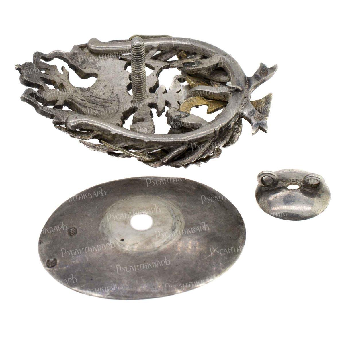 Фирма Дмитрия Осипова. Клейма: на знаке – пробирное «84» и «герб Санкт-Петербурга», именное «Д.О», на прижимной шайбе – именное «ДО», пробирное «84» и «герб Санкт-Петербурга». Серебро, позолота, эмаль. Размер 60,2×43,5 мм. Вес 30,65 г.
