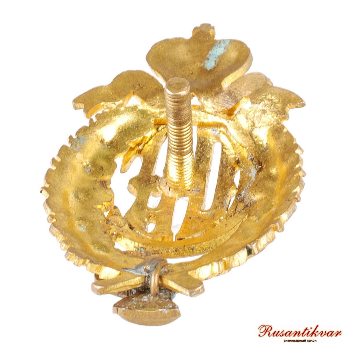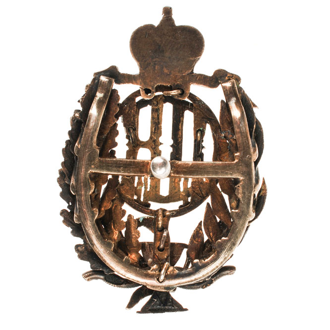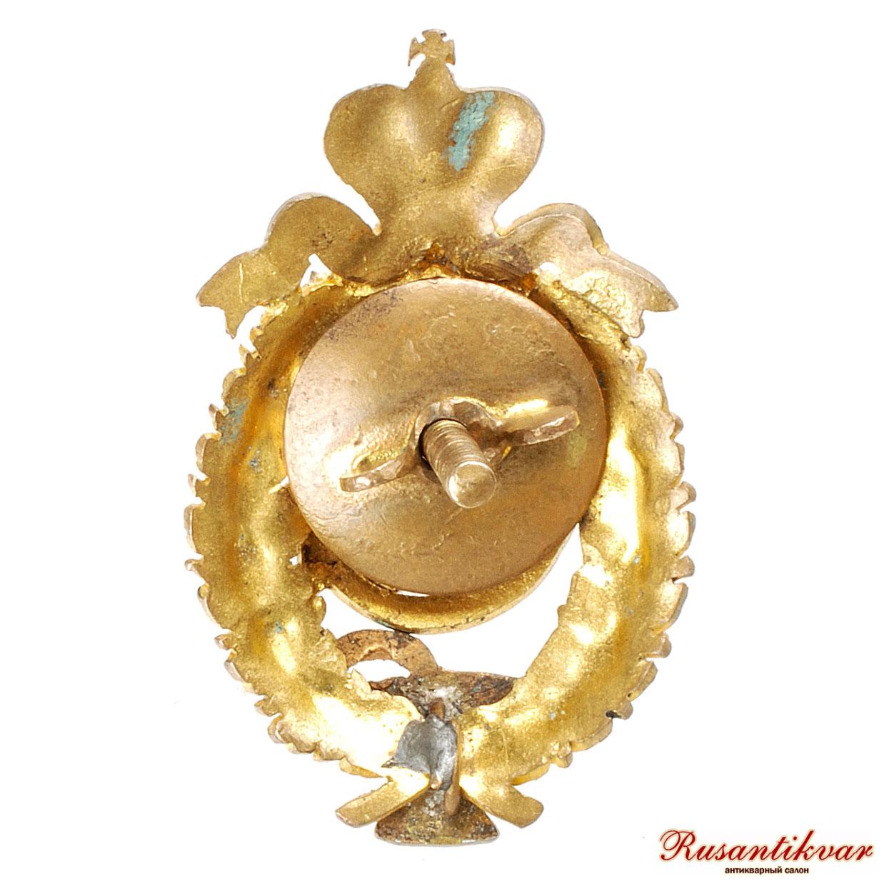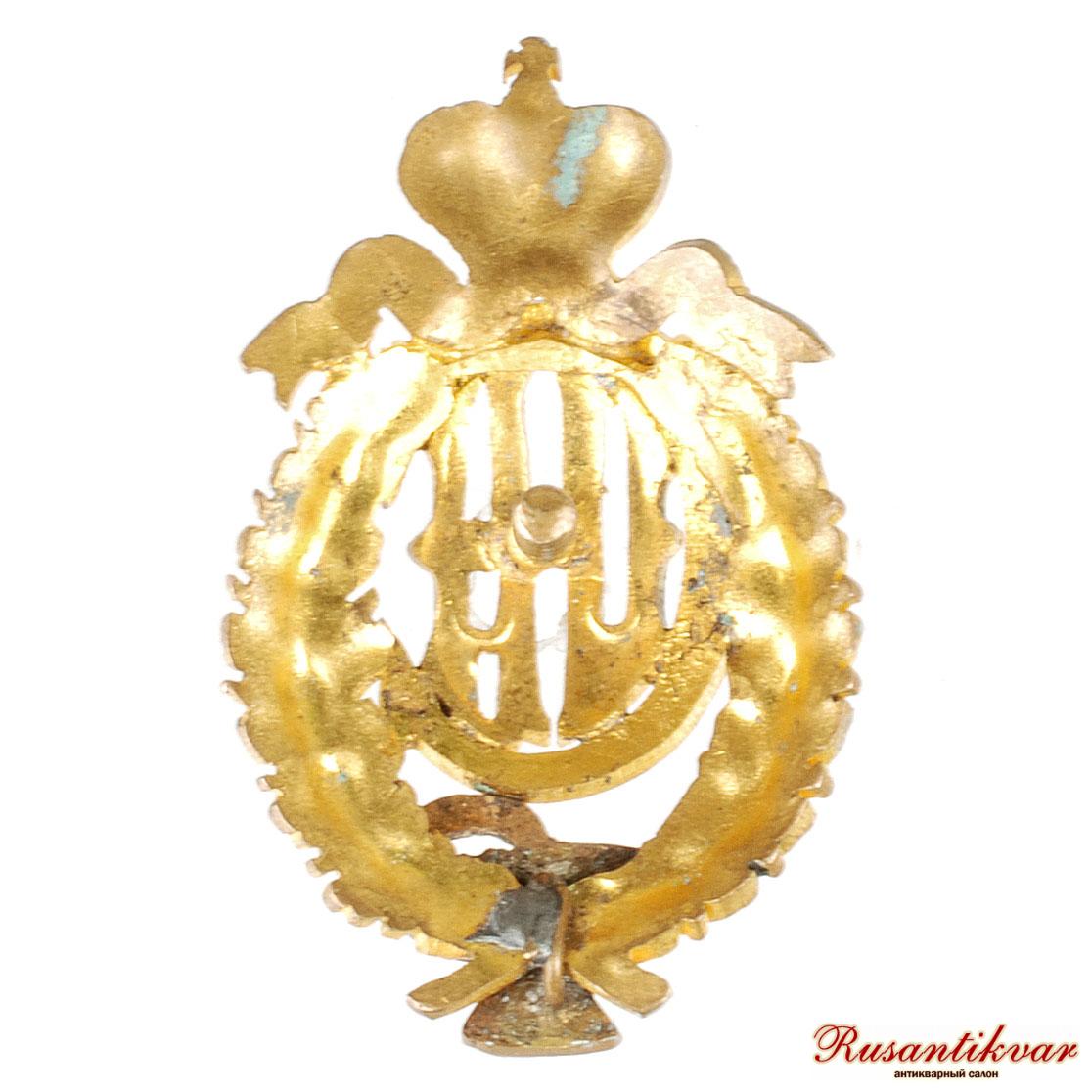 Бронза 15,2 гр, позолота, эмаль Знак овальной формы 49,6х31 мм., состоящий из золотых вензелей Императоров Павла I и Николая II под золотой Императорской короной с ниспадающими золотыми лентами.