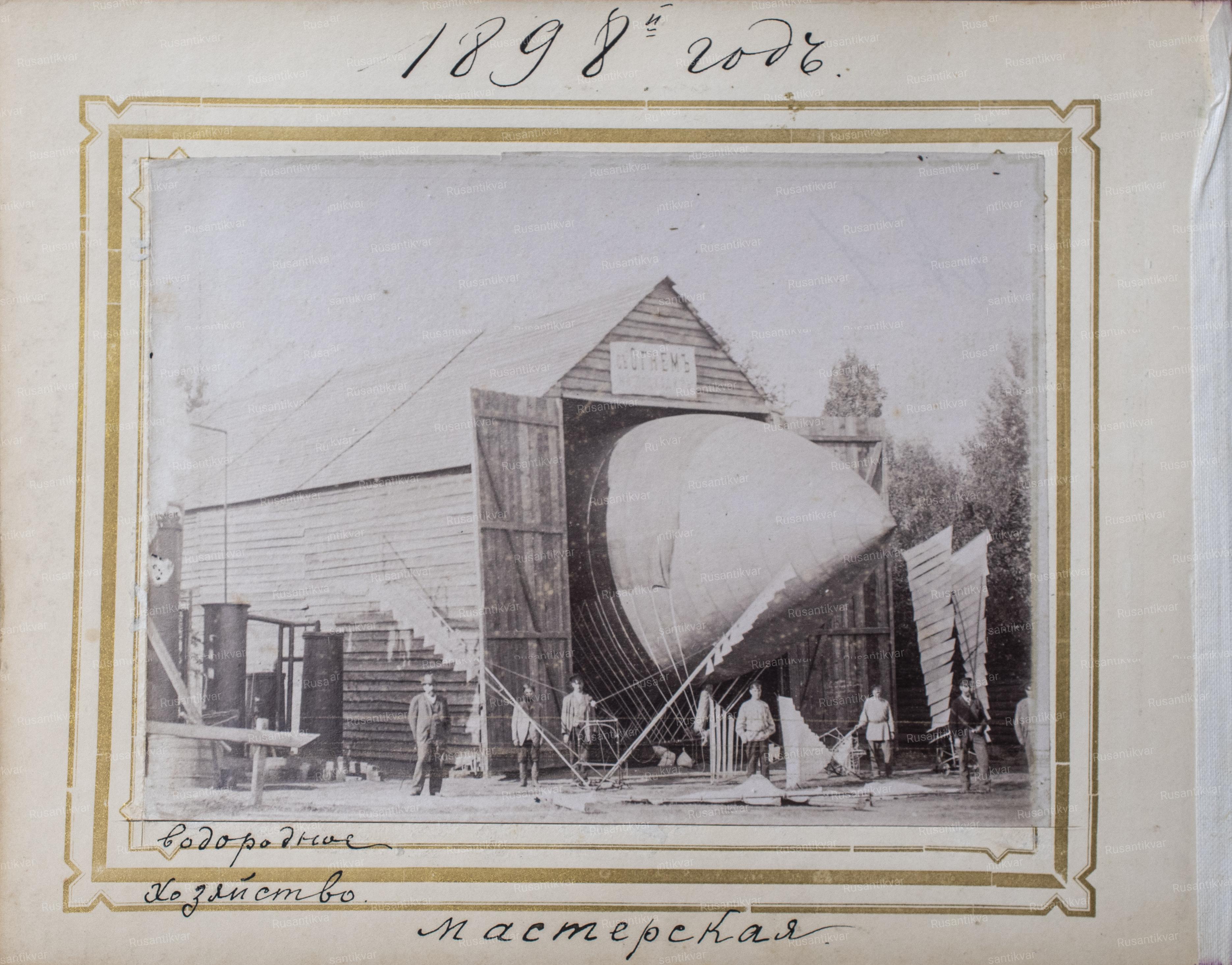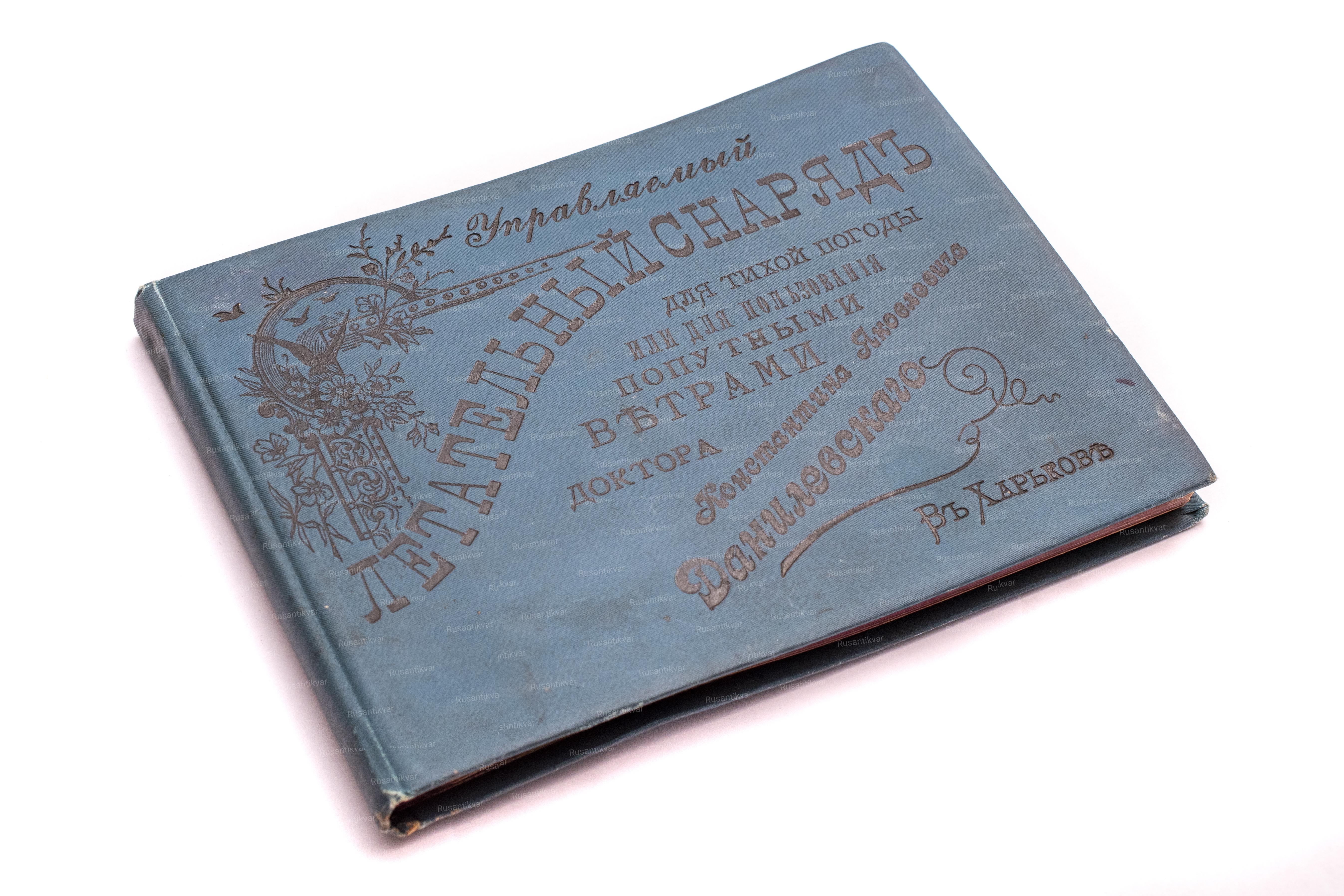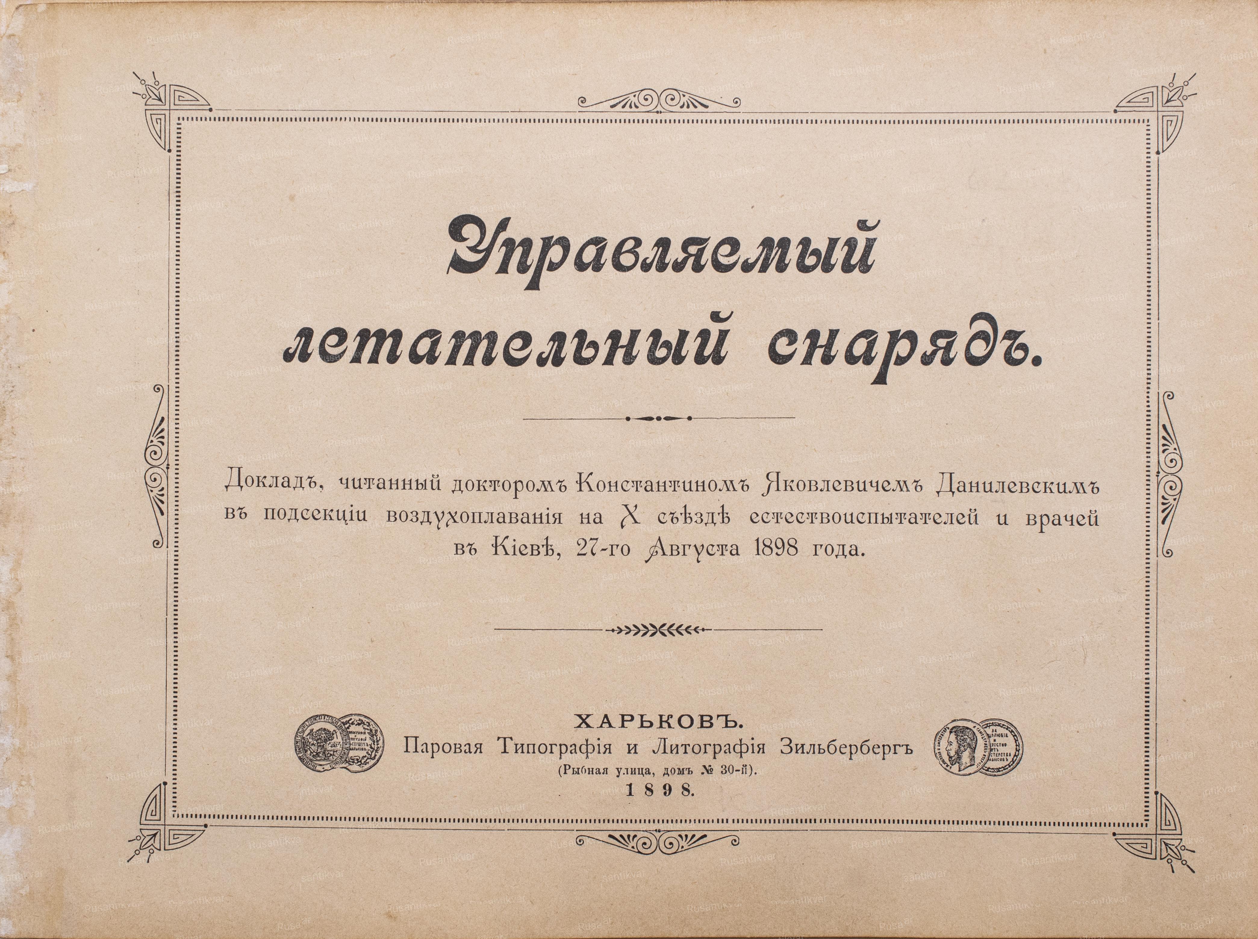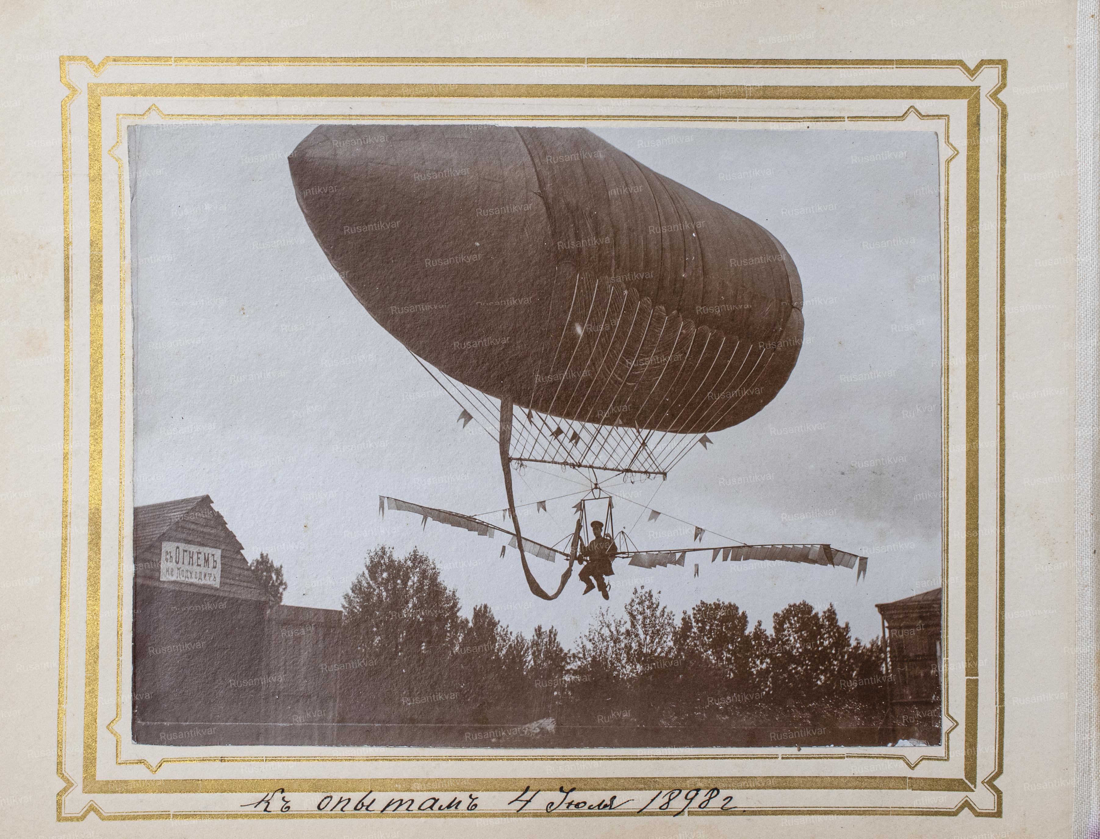 Альбом "Управляемый летательный снаряд для тихой погоды или для пользования попутными ветрами доктора Константина Яковлевича Данилевского в Харькове". 22 фотографии. Вплетен "Доклад, читанный доктором Константином Яковлевичем Данилевским в подсекции воздухоплавания на X съезде естествоиспытателей и врачей в Киеве, 27-го августа 1898 года" (Харьков, 1898. Паровая типография и литография Зильберберга.(Рыбная улица, дом №30-й). 15 с.). Размер фотографий - 10,5х14 см (альбом - 16х21,5 см).