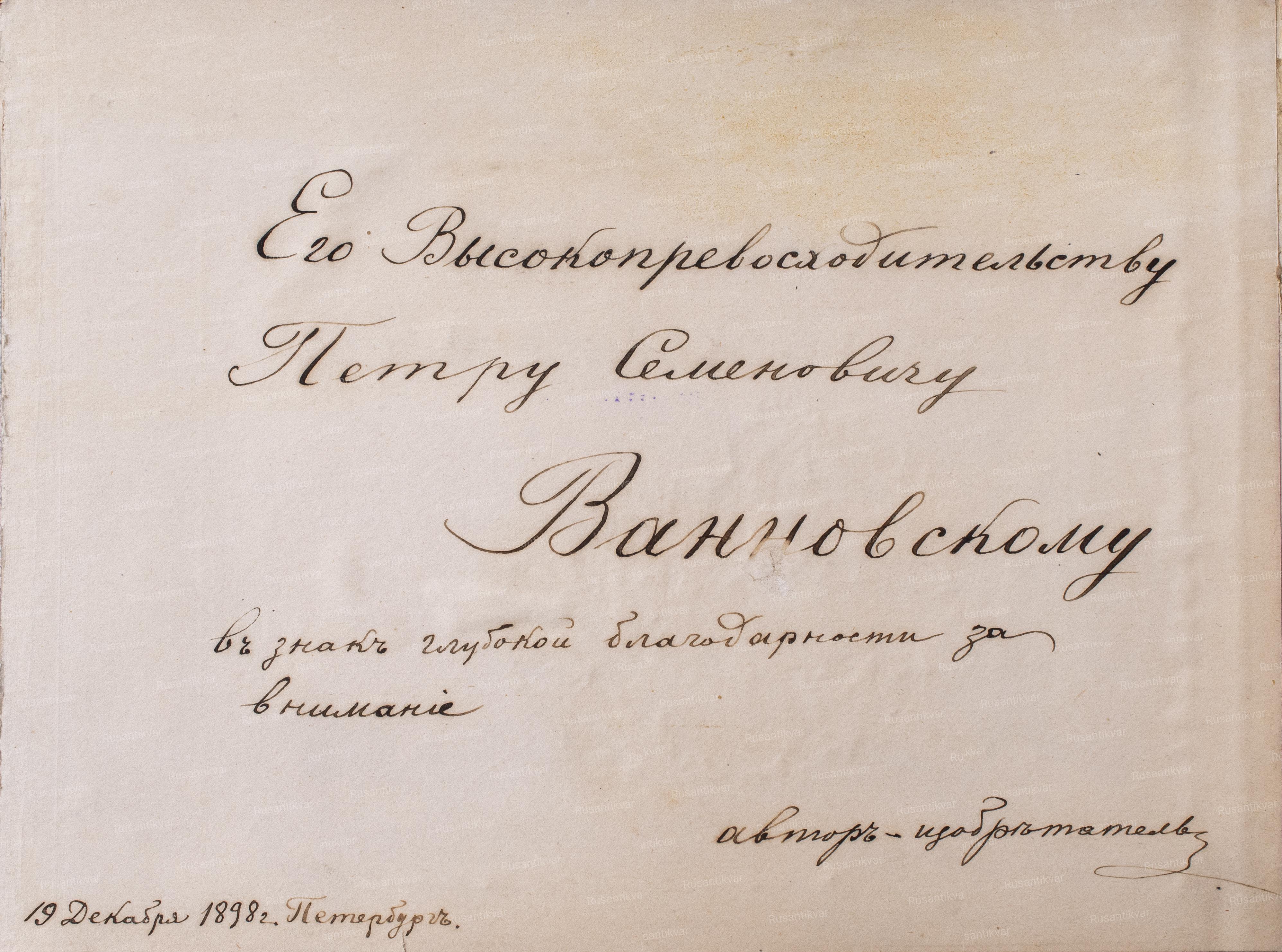 Дарственная надпись на форзаце: "Его Высокопревосходительству Петру Семёновичу Ванновскому в знак глубокой благодарности за внимание. Автор-изобретатель. 19 декабря 1898 г. Петербург".