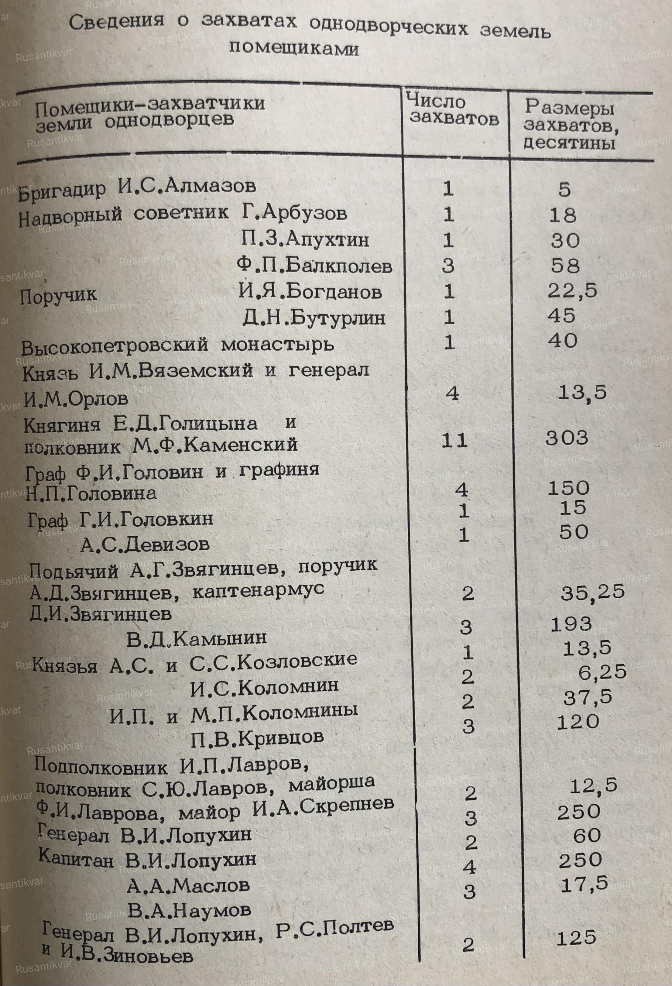 Помещики захватывают: однодворческую землю-40 наказов(жалоб),Луга-35,леса-30,всякие угодья-20,сжатый хлеб и сено в копнах-15,сгоняют однодворцев с земли и дворов,избивая иногда убивая их-18,вопреки запретам покупают однодворческую землю-19,составляют на неё фальшивые купчии-4,на захваченных и купленных однодворческий землях поселяют сёла,деревни и слободы своих крестьян-36,строят мельницы,затапливают однодворческие луга и выгоны,запрещают пользоваться плотинами и ловить рыбу-19,захватывают дочерей и вдов однодворцев и насильно выдают их замуж за своих крепостных-19 наказов.