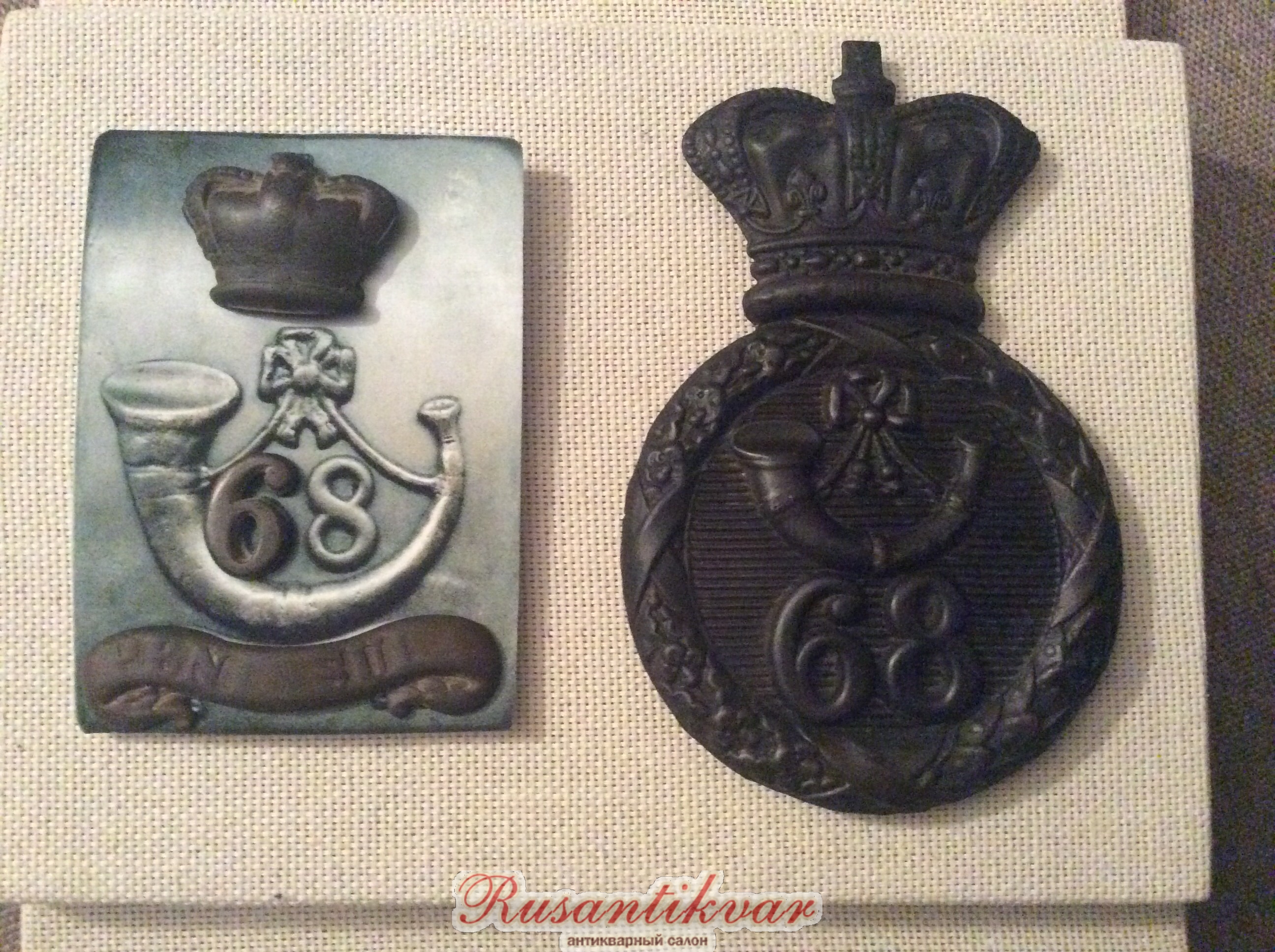 Справа с накладными элементами ( отдельно накладываются на пластину - цифры 6 и 8 , девиз , дудка , корона ).