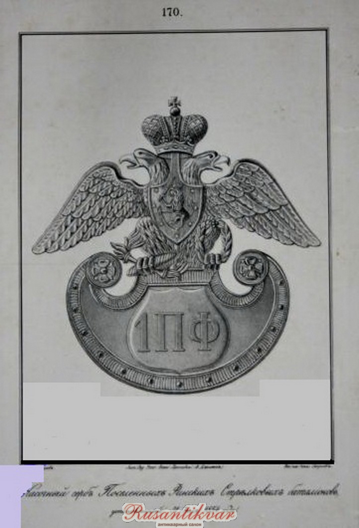Каска - (металлический прибор из белой жести) в гербе на каске на груди орла - гeрб Великого Княжества Финляндского, с литерами 1. П. Ф. и 2. П. Ф.; каска султана не имеет.