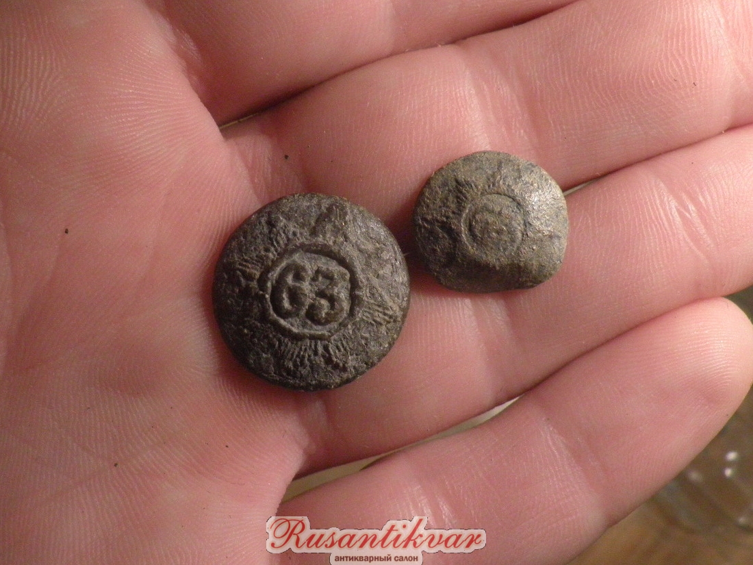Маленькая как всегда затертая и с традиционно гнутым краем ( почти все маленькие пуговицы 63 -го полка искуственно гнуты с одного бока . По версии - чтобы плотнее прижимать сукно мундира из-за слишком длинного ушка пуговицы ).