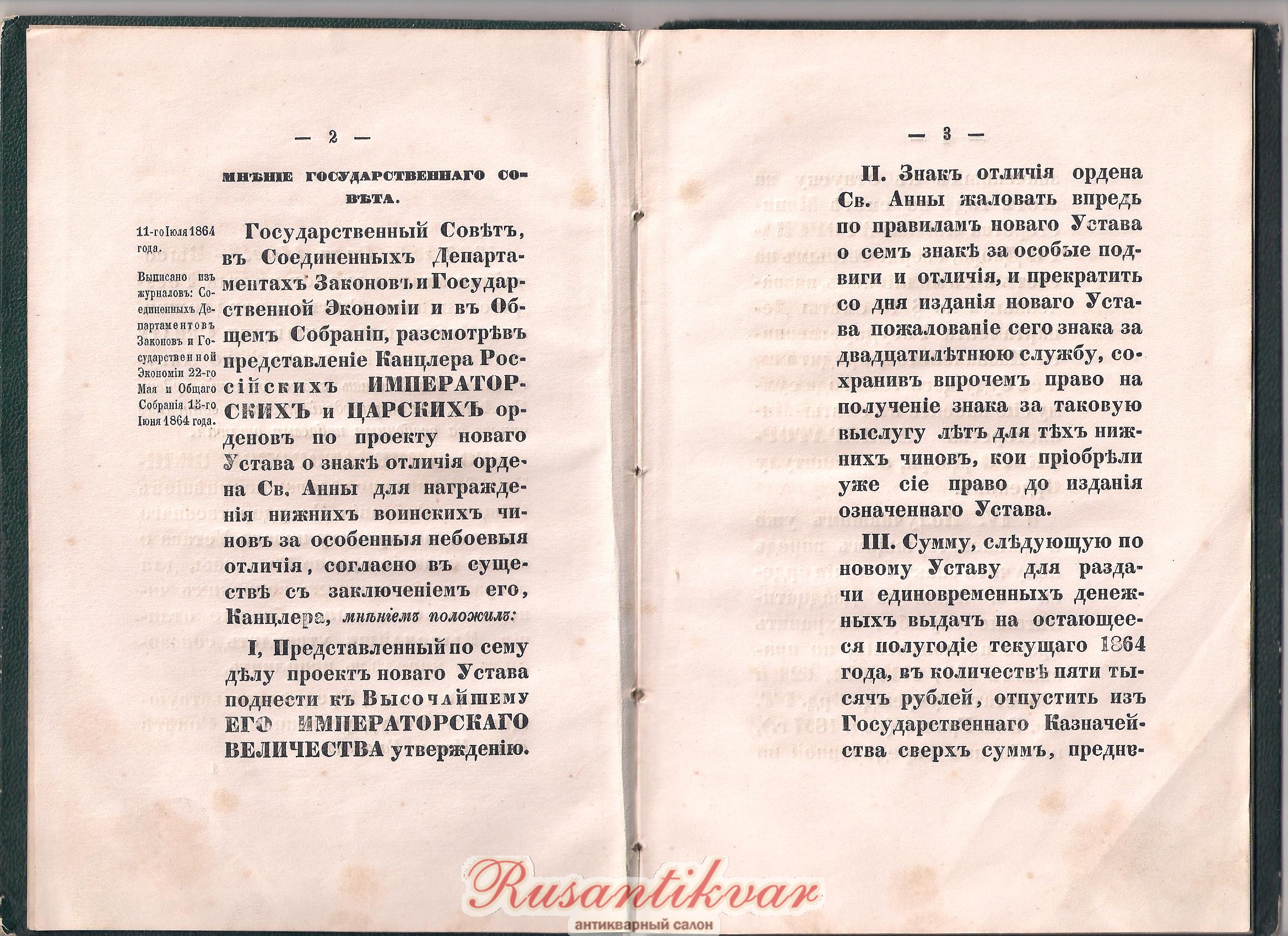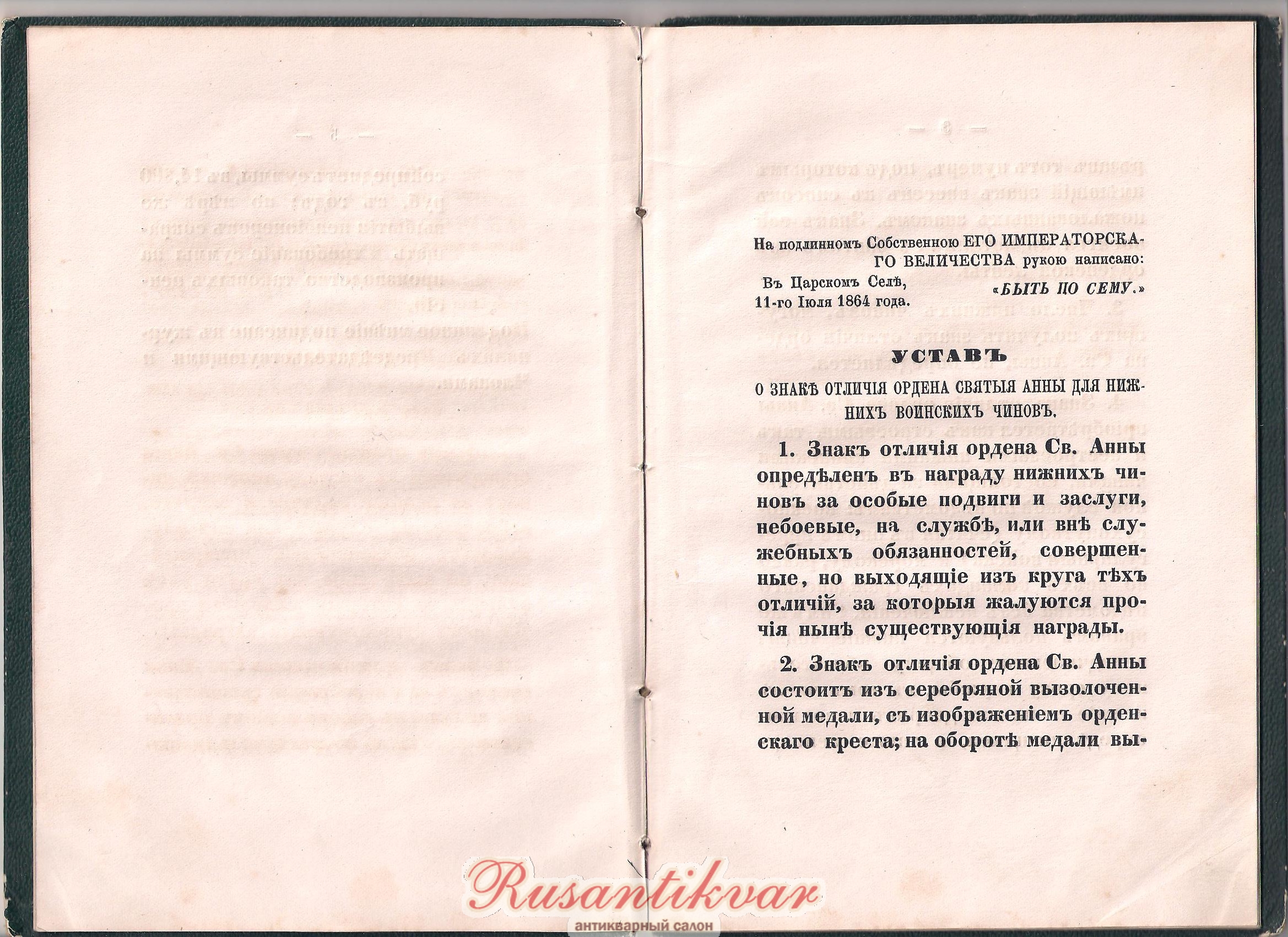 "Устав о знаке отличия ордена Св.Анны для нижних чинов и правило о думе сего знака 1864 год".