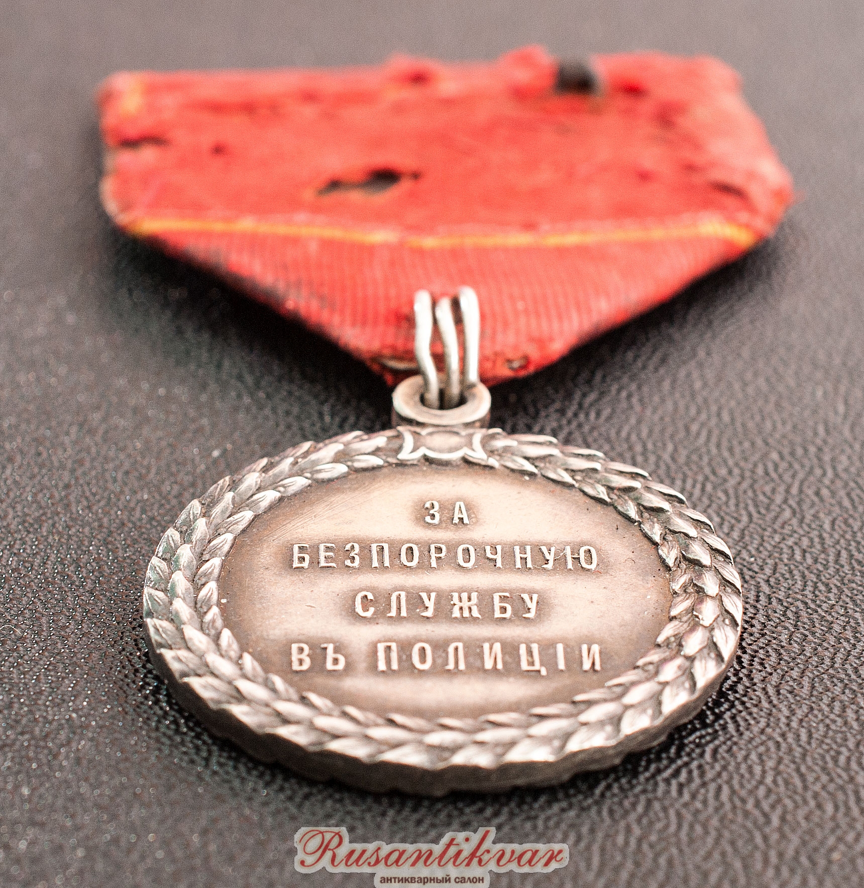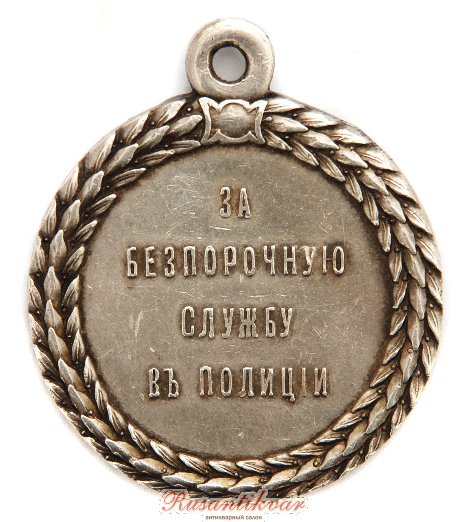 Медаль "За беспорочную службу в полиции" с портретом Императора Александра III. Ранний тип штемпеля, имя медальера « Л. ШТЕЙНМАНЪ Р.» на поле медали.