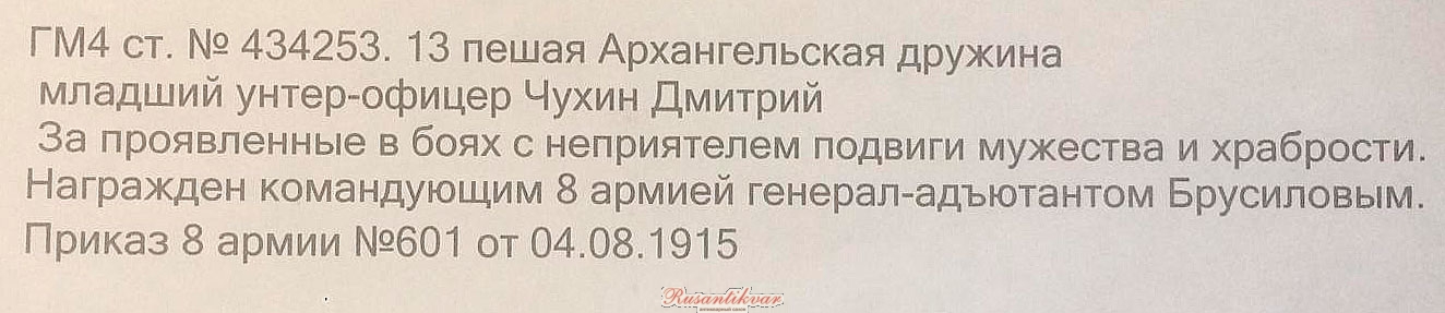 За то, что при атаке укрепленных позиций противника 3.07.1916, в 2 часа дня, у горки, восточнее дер. Леп, когда рота, попав под фланговый пулеметный огонь, вынуждена была остановиться в 100 шагах от атакуемого неприятельского окопа, не имея возможности подавить пулеметный огонь и принужденная оставаться в таком положении, пока не было получено приказание отходить, по собственной инициативе, подполз еще ближе, расположившись флангом к противнику, но, зато в свою очередь, стал обстреливать во фланг пулемет неприятеля и держал его под огнем во время всего отхода, чем способствовал значительному уменьшению потерь и сам, отходя последним, взял от убитых и тяжело раненых 7 винтовок и доставил их в расположение роты