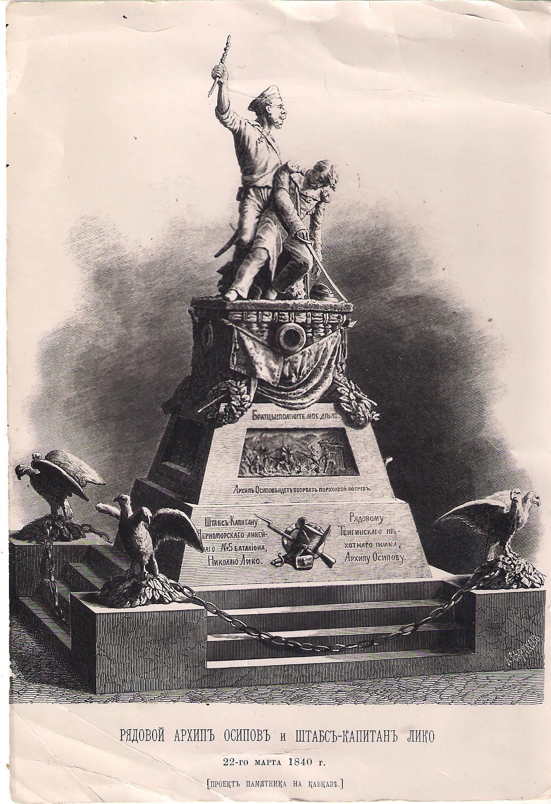 Проект памятника рядовому Архипу Осипову и штабс-капитану Николаю Лико на Кавказе 1840 год.
