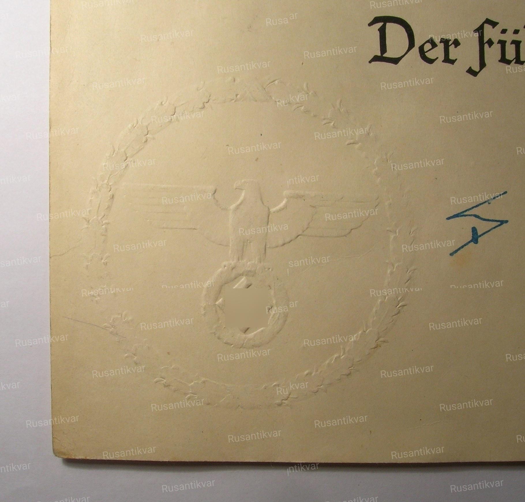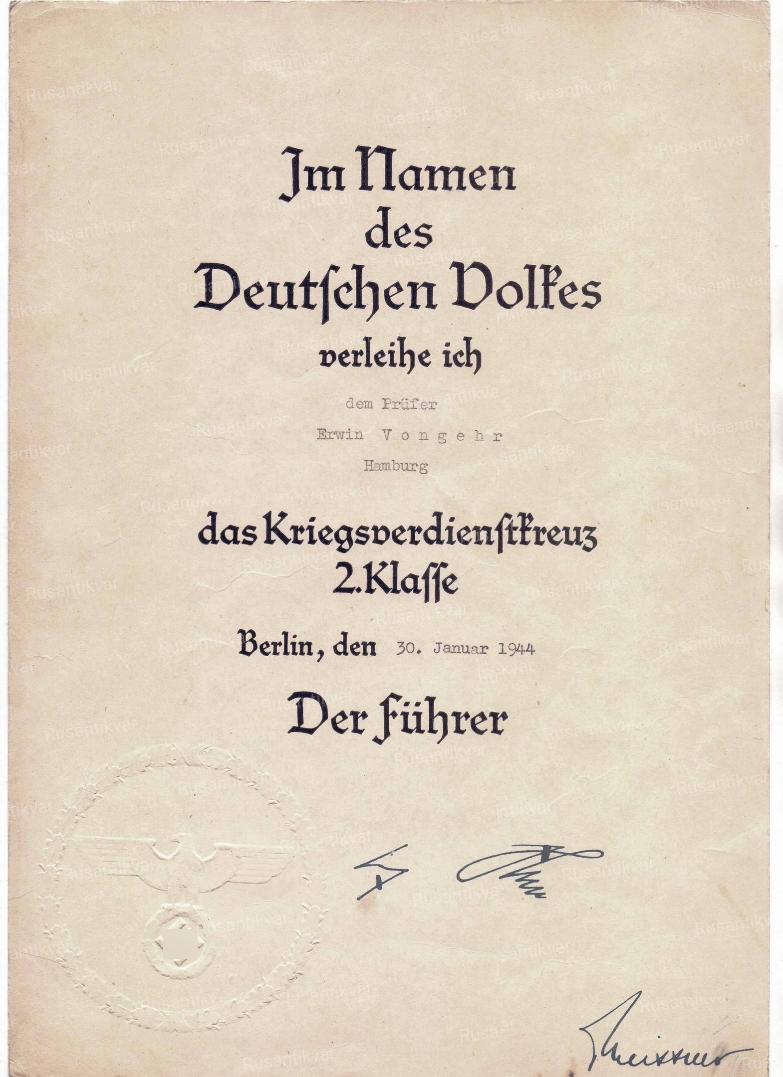 Наградной документ на Крест военных Заслуг 2-го класса без мечей. Вручён Эрвину Вонгеру из Гамбурга 30 января 1944 года.