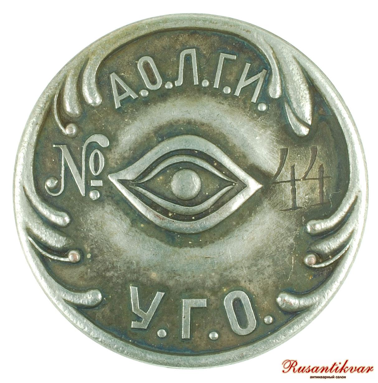 Сверху на знаке нанесена аббревиатура «А.О.Л.Г.И.»-Административный отдел Ленинградского Губернского исполкома. По центру изображена золотая фигура, сильно напоминающая человеческий глаз. Слева от него выгравирован символ «№», справа – цифра-личный номер сотрудника. В нашем случае «44».