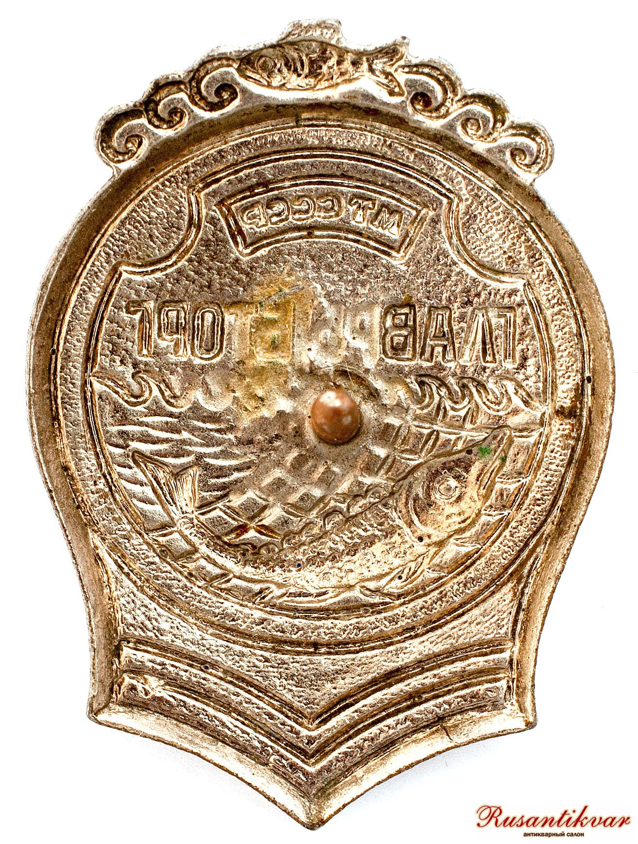 Знак "Главрыбторг (Главное управление по торговле рыбой и рыбопродуктами). Министерство торговли СССР" . Латунь, серебрение, эмаль.
