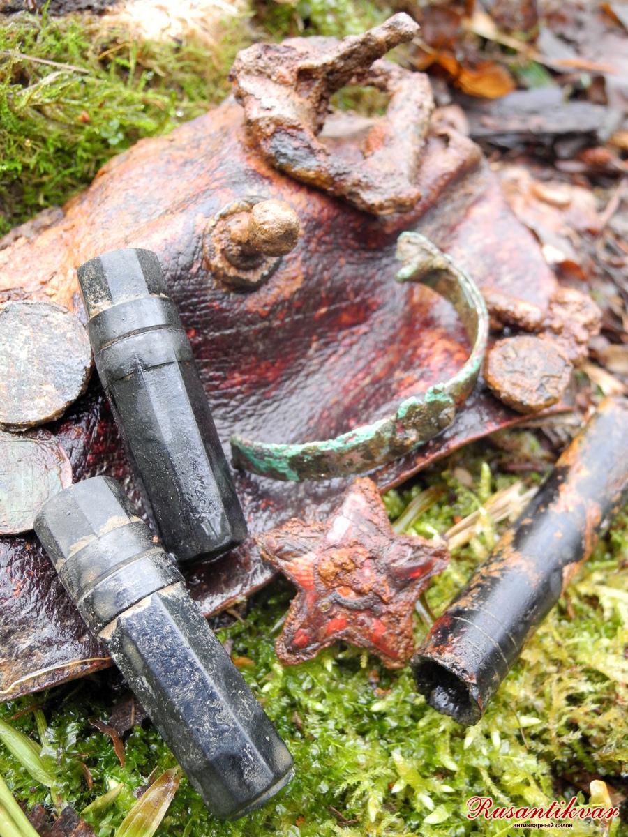 4 мая 2014 года мы снова продолжили методичную работу на той же сопке – Сергей решил заново перекопать давно вскрытую кем-то площадку под палатку. Глубина небольшая, по колено, размер - два с половиной на два с половиной метра. Товарищ убирает упавшие ветки вокруг оплывшей ямы, вырубает молодой подлесок на старых слежавшихся отвалах. Среди палой листвы и пробивающейся весенней травы видна торчащая из дёрна бедренная кость, выбеленная дождями… Расчистив все брустверы от мусора, замечаем человеческие останки со всех сторон старого раскопа. Таких откровенно мародёрских раскопов в наших местах почти не встречается – давным-давно все «неофициалы» или передают останки поисковым отрядам, или прикапывают на месте, поставив крест. Но тут совсем другая история… Похоже, здесь копали лет 20 назад и об уважении к погибшим никто не задумывался. Перебрав мародёрские отвалы, принимаемся за повторный перекоп самой площадки – от стен зачищаем к центру. Судя по количеству костных останков – здесь трое бойцов. К счастью, мародёры немного не докопали – оставив в середине не вскрытый «островок» около 70 см в длину. Вместе с останками находим в нём кожаный подсумок для винтовки СВТ, самодельный костяной мундштук для папирос, ржавую звездочку пилотки с алой эмалью довоенного выпуска, гнилые винтовочные патроны… Но главное – в этом нетронутом островке были два медальона!!! Сразу же убрали их в герметичную тару для последующей экспертизы.