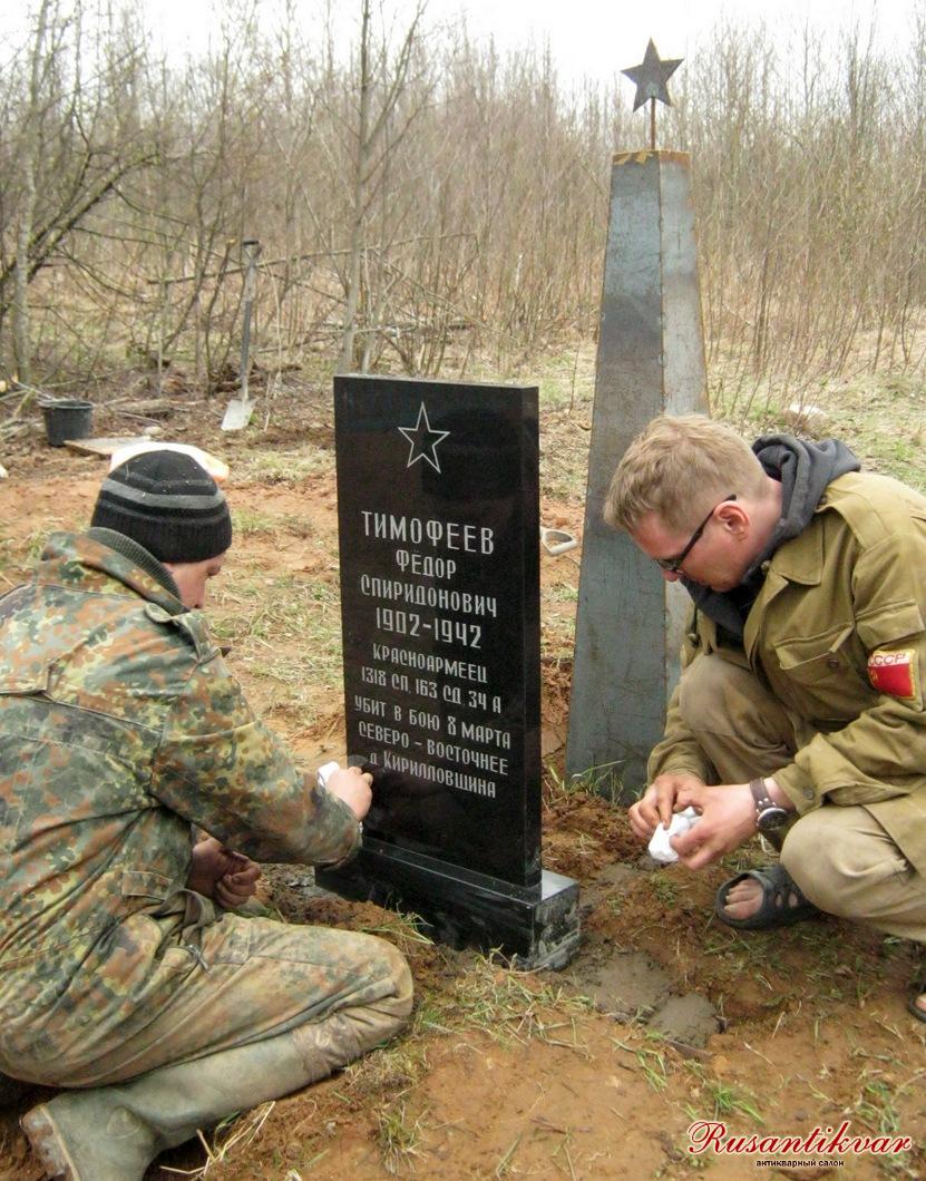Семьдесят два года Федор Спиридонович Тимофеев вместе с однополчанами был засыпан в оплывшем блиндаже, пока его имя было выбито на плитах военного кладбища в Эстино, под громким лозунгом «НИКТО НЕ ЗАБЫТ. НИЧТО НЕ ЗАБЫТО». После варварского раскопа мародёров, его останки ещё 20 лет омывались дождями, а медальон продолжал лежал на метровой глубине в плотной красной глине, и записка в нём не пропала… Как получилось, что полтора десятка лет мы проходили мимо места его гибели, проводя раскопки в 20-30 метрах? Не знаю… Наверное, нужно было, чтобы все эти неслучайные совпадения оказались связаны вместе и, как бусины, нанизаны на нитку истории. И звонок Василия Николаевича командиру нашего отряда Алексею, и просьба Алексея найти на картах «высоту 195», и необъяснимое желание перекопать за кем-то бесперспективный шурф в «отработанном» районе, и нетронутость мародерами маленького участка с медальоном, и плотно закрученный бакелитовый пенал, и заполнение простым карандашом, и много других небольших, но очень важных мелочей, благодаря которым внук встретился со своим погибшим дедом…