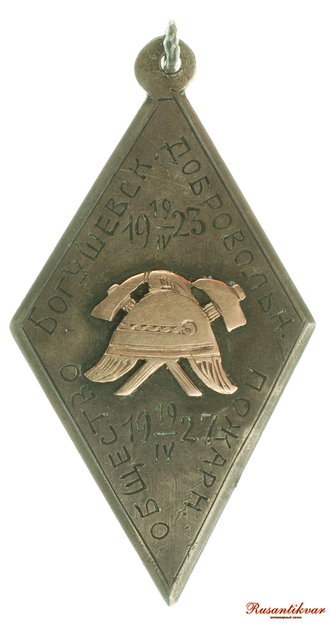 Жетон Богушевского добровольного пожарного общества. СССР. 1927 г. Неизвестная мастерская. Без клейм. Серебро, золото; 9,72 г. Размеры 58,5×31,3 мм. Сохранность почти отличная. Принадлежал В.Л. Иткину. Гравировки: на лиц. ст. — «Богушевск. добровольн. пожарн. общество / 19 19/IV 23 /19 19/IV 27»; на об. ст. в 5 строк: «Честному / тружен. / на пожарн фронте / В.Л. / Иткину».
