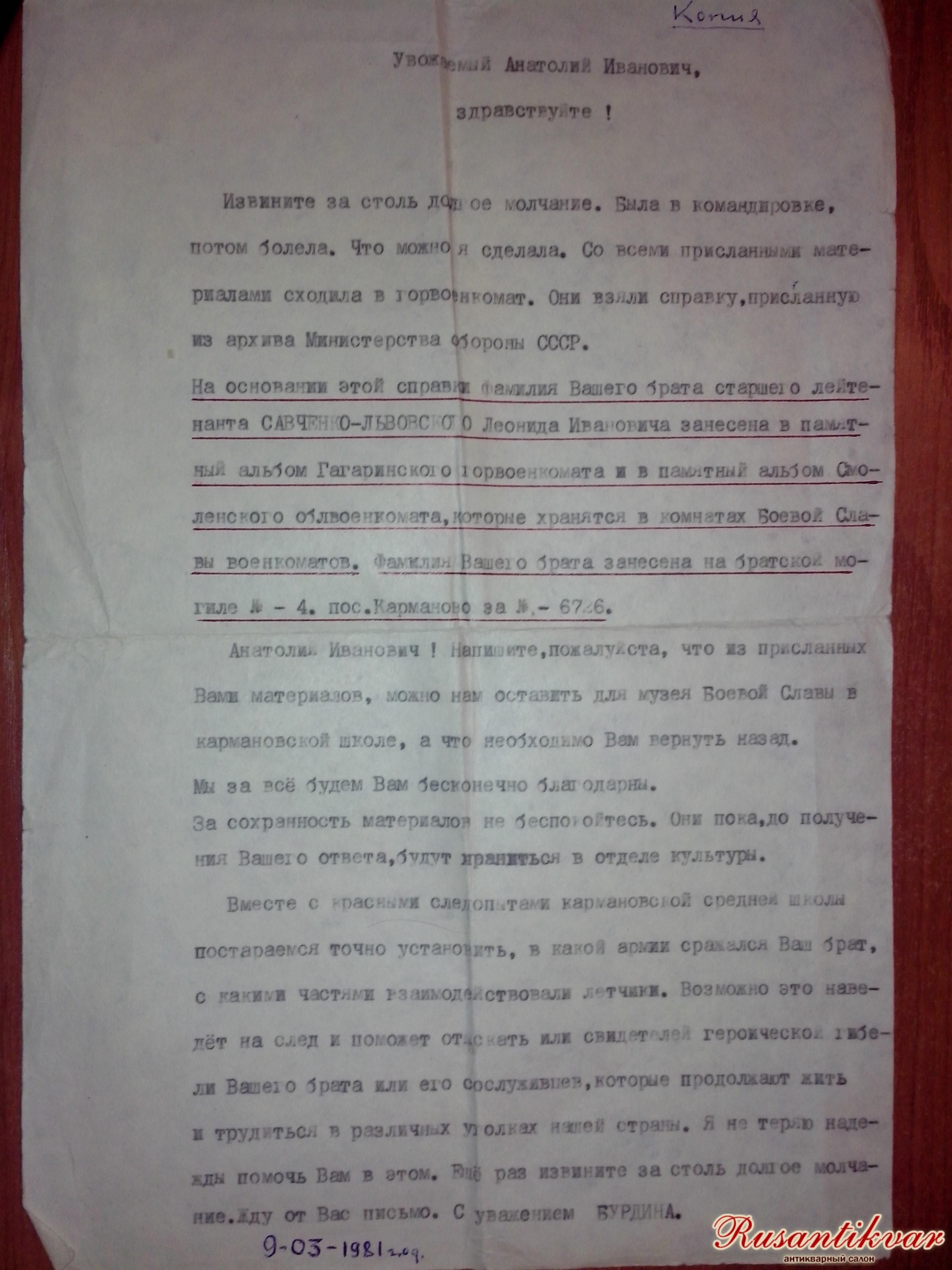 Вместе с красными следопытами кармановской средней школы постараемся точно установить, в какой армии сражался Ваш брат, с какими частями взаимодействовали лётчики. Возможно, это наведёт на след и поможет отыскать или свидетелей героической гибели Вашего брата, или его сослуживцев, которые продолжают жить и трудиться в различных уголках нашей страны. Я не теряю надежды помочь Вам в этом. Еще раз извините за столь долгое молчание. Жду от Вас письмо. С уважением, Бурдина. 9.3.1981 год».