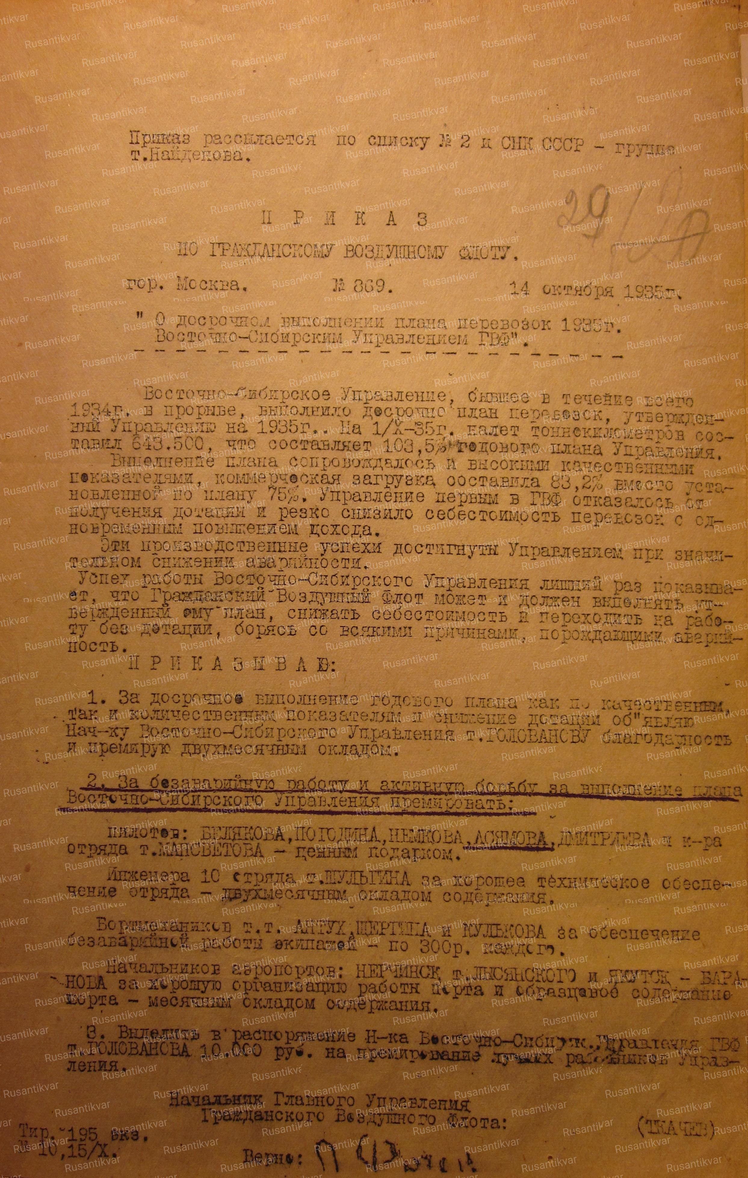 1. Приказ о награждении пилотов по выполнению плана воздушных перевозок в 1935 году.