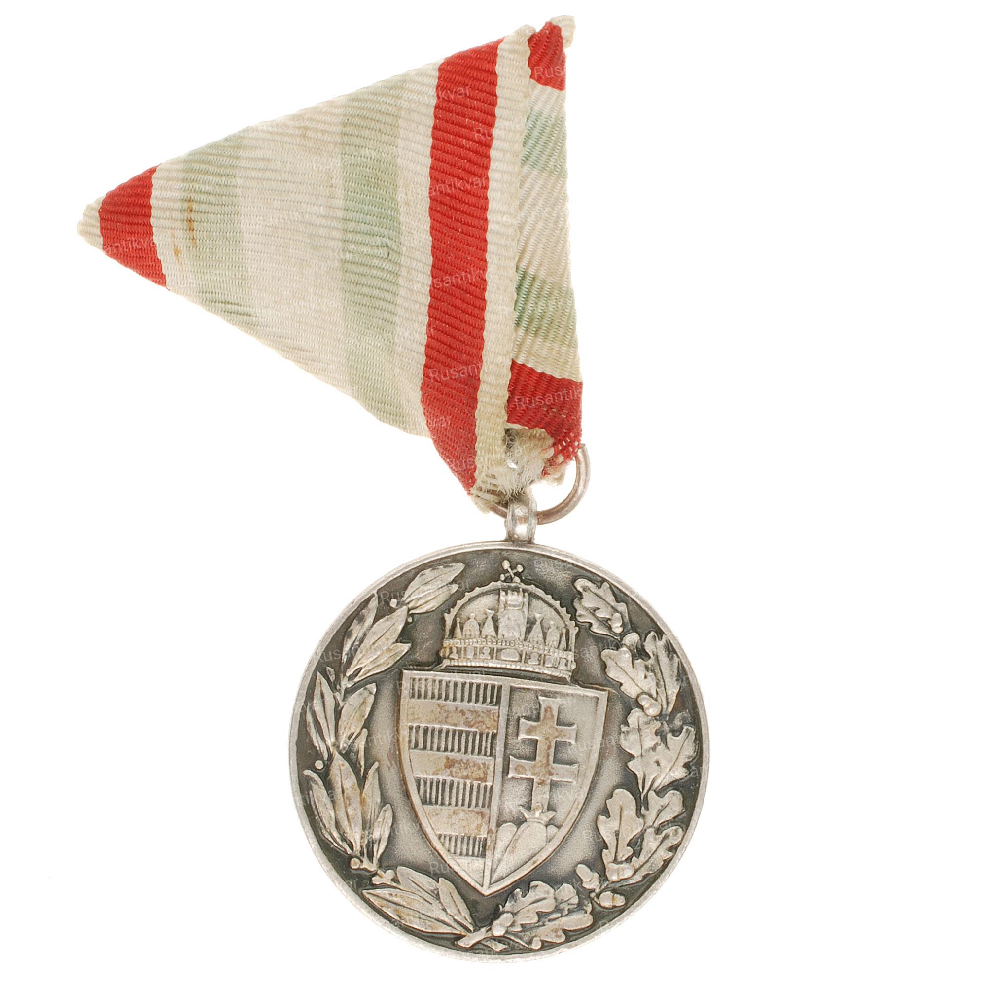 Медаль «Ветеранов 1 Мировой войны» (оригинальное название на венгерском языке; Haborus Emlekerem kardokkal es sisakka) для некомбатантов. Королевство Венгрия. Медаль была учреждена 14 ноября 1929 года по приказу регента венгерского королевства Миклоша Хорти (1920-1944 гг.). Награждались ветераны австро-венгерской армии, не принимавшее непосредственное участие в 1 Мировой войне 1914-1918 гг.