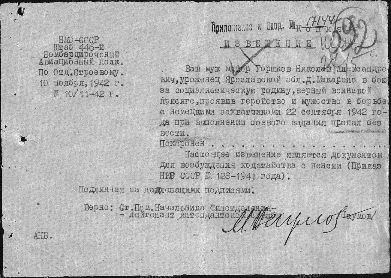 Данные, указанные в карточке немного удивили нас. Во-первых, в ней был неправильно указан номер полка, в котором проходил службу майор Горшков вместо 448-го штурмового авиаполка, был записан 446-й полк. Затем разными приказами Главного управления кадров Народного комиссариата обороны он значился пропавшим без вести разными датами - сначала 22 июля, потом 22 сентября 1942 года. В первоначальных сведениях полученных из картотеки потерь личного состава ВСС Красной Армии мы знали, что Н.А. Горшков на момент гибели значился командиром авиаэскадрильи, в карточке же должность Горшкова была указана как – штурман полка. В переписке по личному составу 448-го полка Николай Александрович вообще значился летчиком штрафного звена.