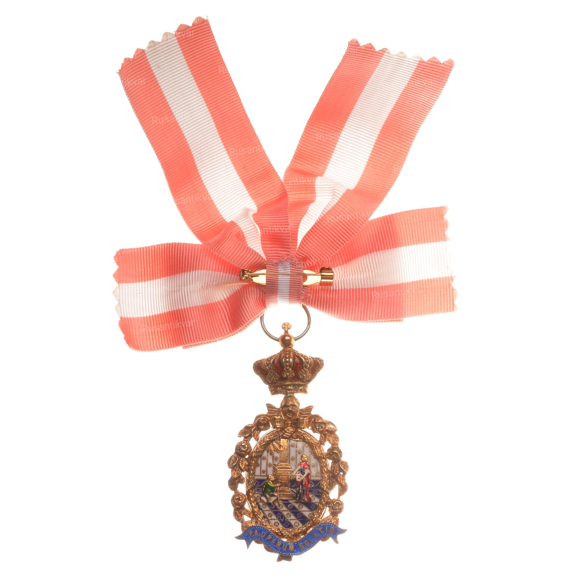 Орден представляет собой узорный золотой медальон с изображением раздающей милостыню святой в центре. Внизу девиз PAUPERUM SOLATIO (утешение бедных). Лента у ордена бело-розовая.