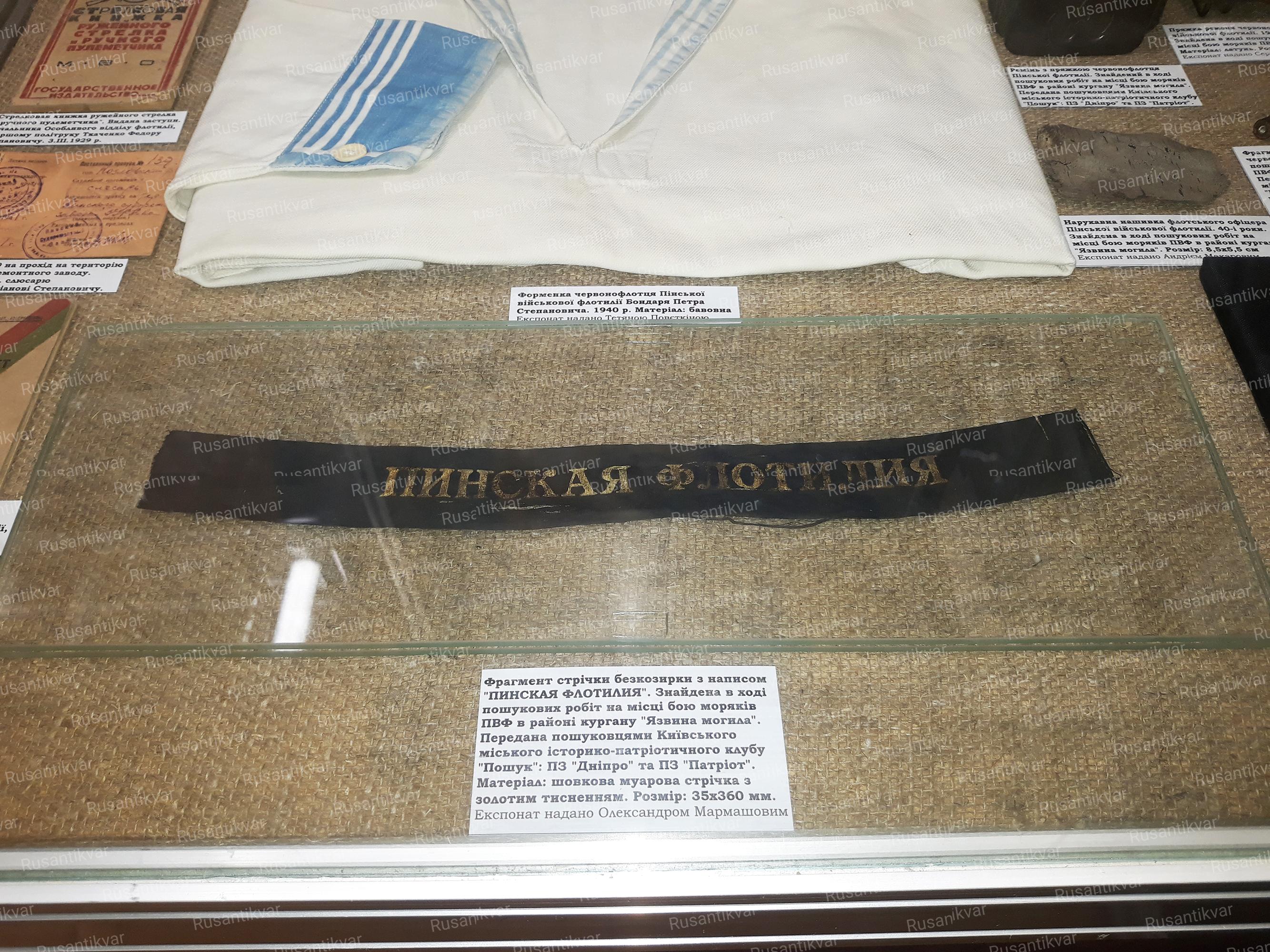 Самой главной находкой и безусловным гвоздём экспозиции стала лента бескозырки с надписью «ПИНСКАЯ ФЛОТИЛИЯ», найденная 13 апреля 2008 года в районе кургана «Язвина могила». Над реставрацией этой ленты специалисты корпели три месяца. На сегодняшний день, это единственная известная лента в музейной коллекции. А из личных вещей найденных краснофлотцев к числу уникальных можно отнести надписанную ложку погибшего по имени Боря. Держало было загнуто так, чтобы инструмент удобнее было носить в сапоге. На черпале он нацарапал бутылку, бокал, трубку и сердце, окружив их надписью «Да сбудутся мои мечты».