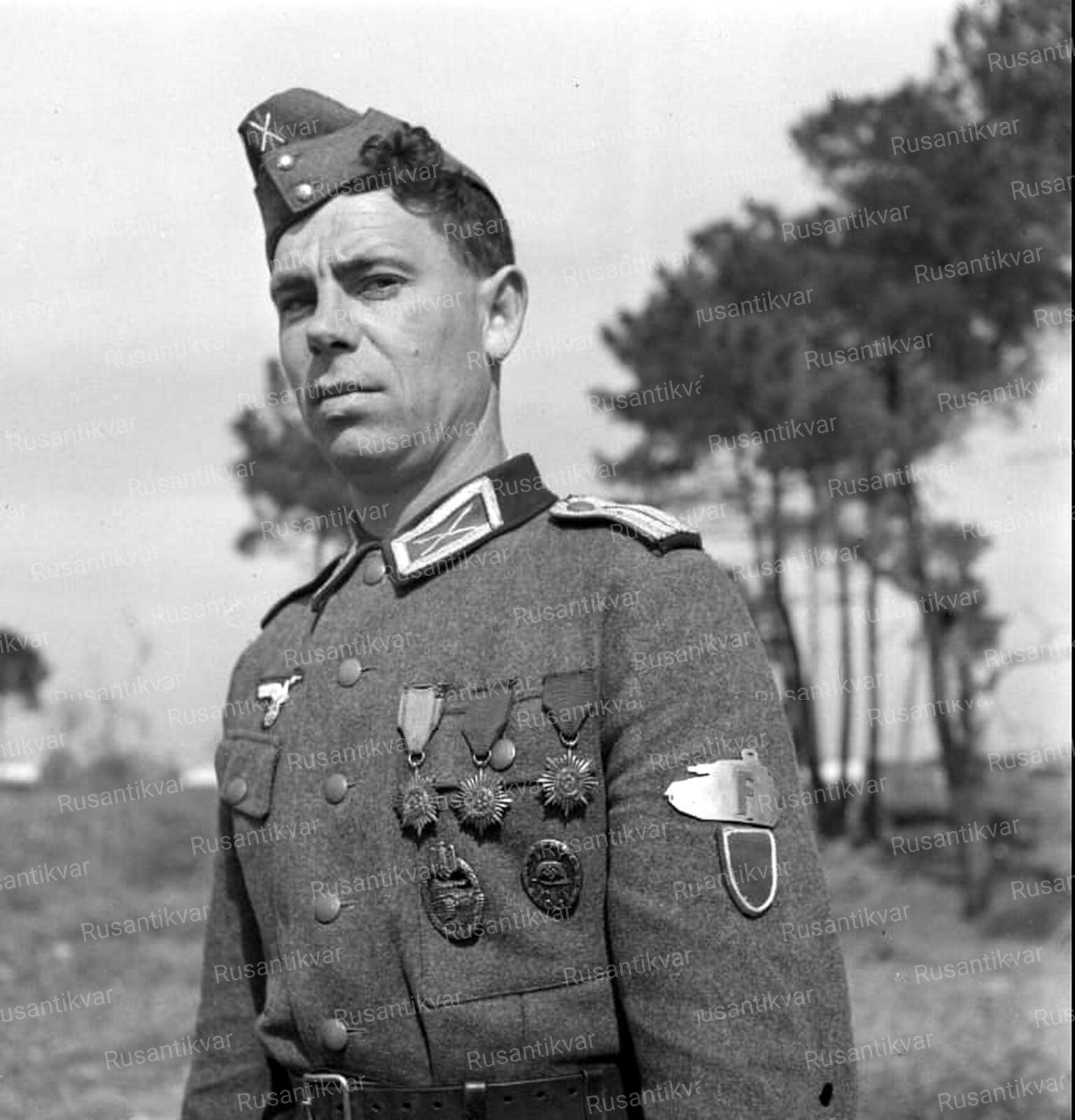 На груди лейтенанта три знака Ostvolkmedaille 2го класса в бронзе, серебре и золоте. Кроме того, черный знак за ранение и нагрудный знак за танковые атаки.