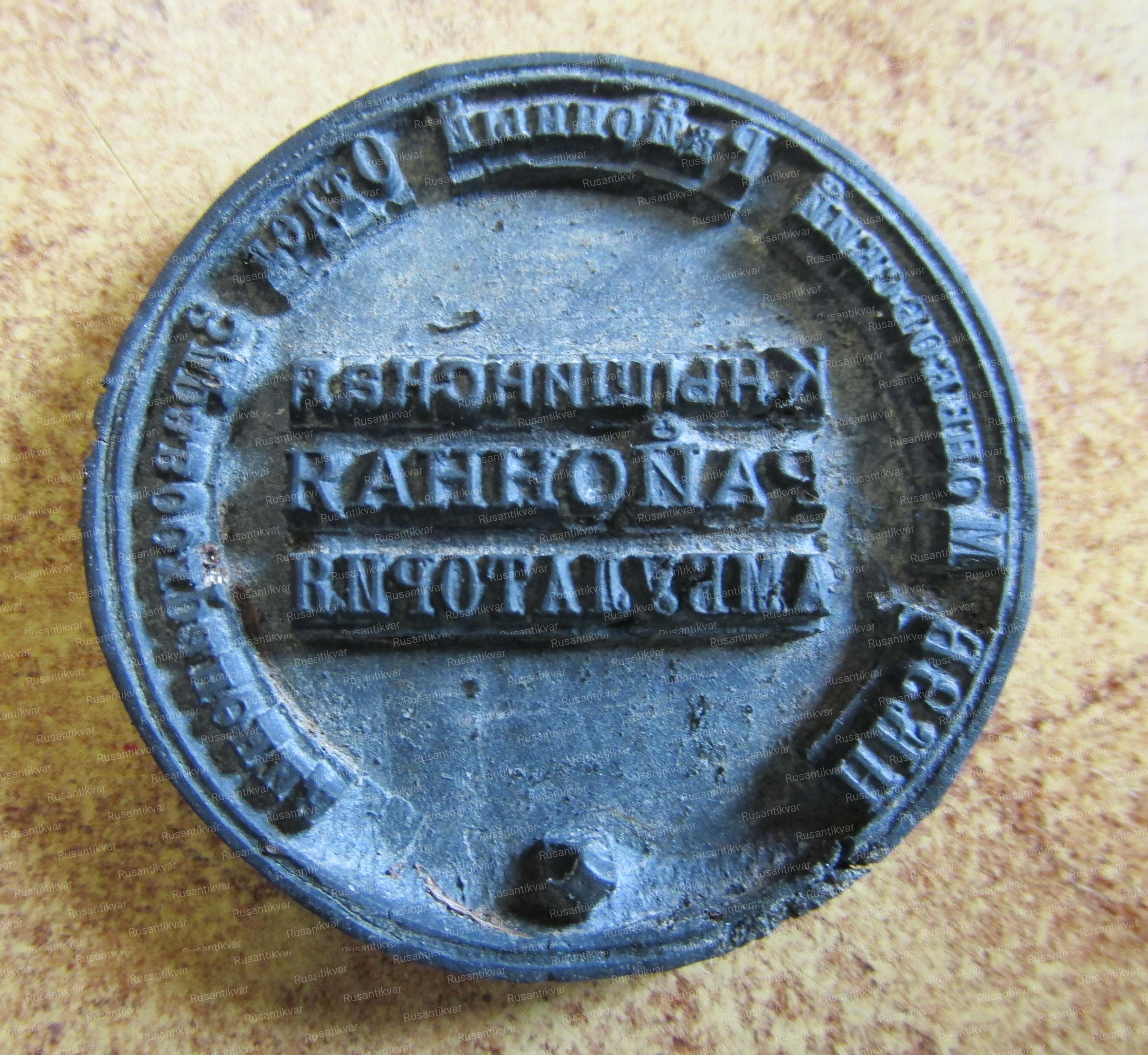 Латунная печать «Печать для опечатывания. Упр. Нар. Ком. Внутр. Дел по Белостокской области. Августовская городская пожарная охрана» (фото 6-1, 6-2) + самодельные жетоны 5-й и 10-й пожарных команд - найдены без останков погибших военнослужащих РККА (останки были найдены в 30 и 70 метрах от места обнаружения печати и жетонов соответственно) при проведении поисковых работ в Кокощицком лесу в августе 2015 г.