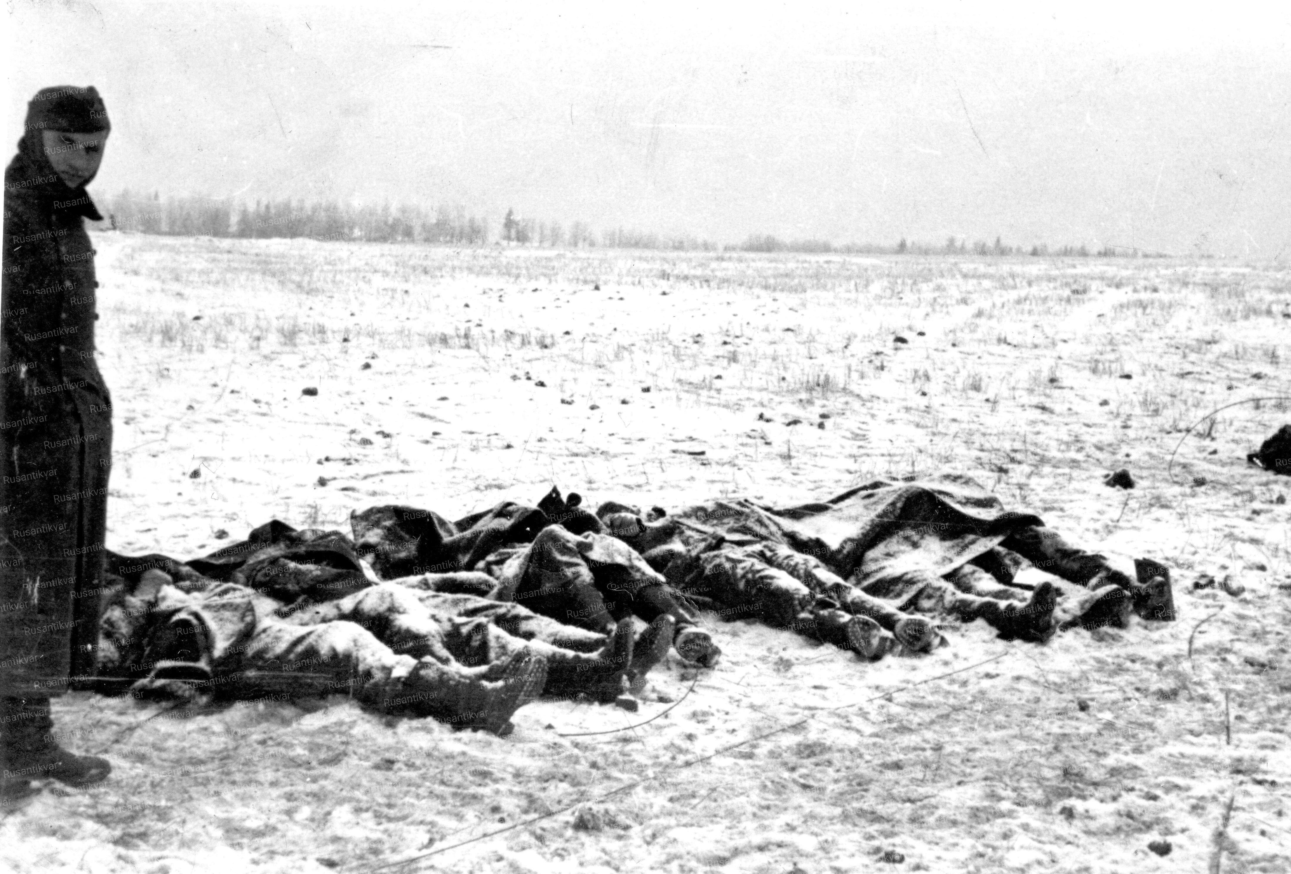 14. 5 ноября 1941 года, деревня Петряиха. 185-й пехотный полк 87-й пехотной дивизии вермахта. Немцы собирают погибших товарищей.