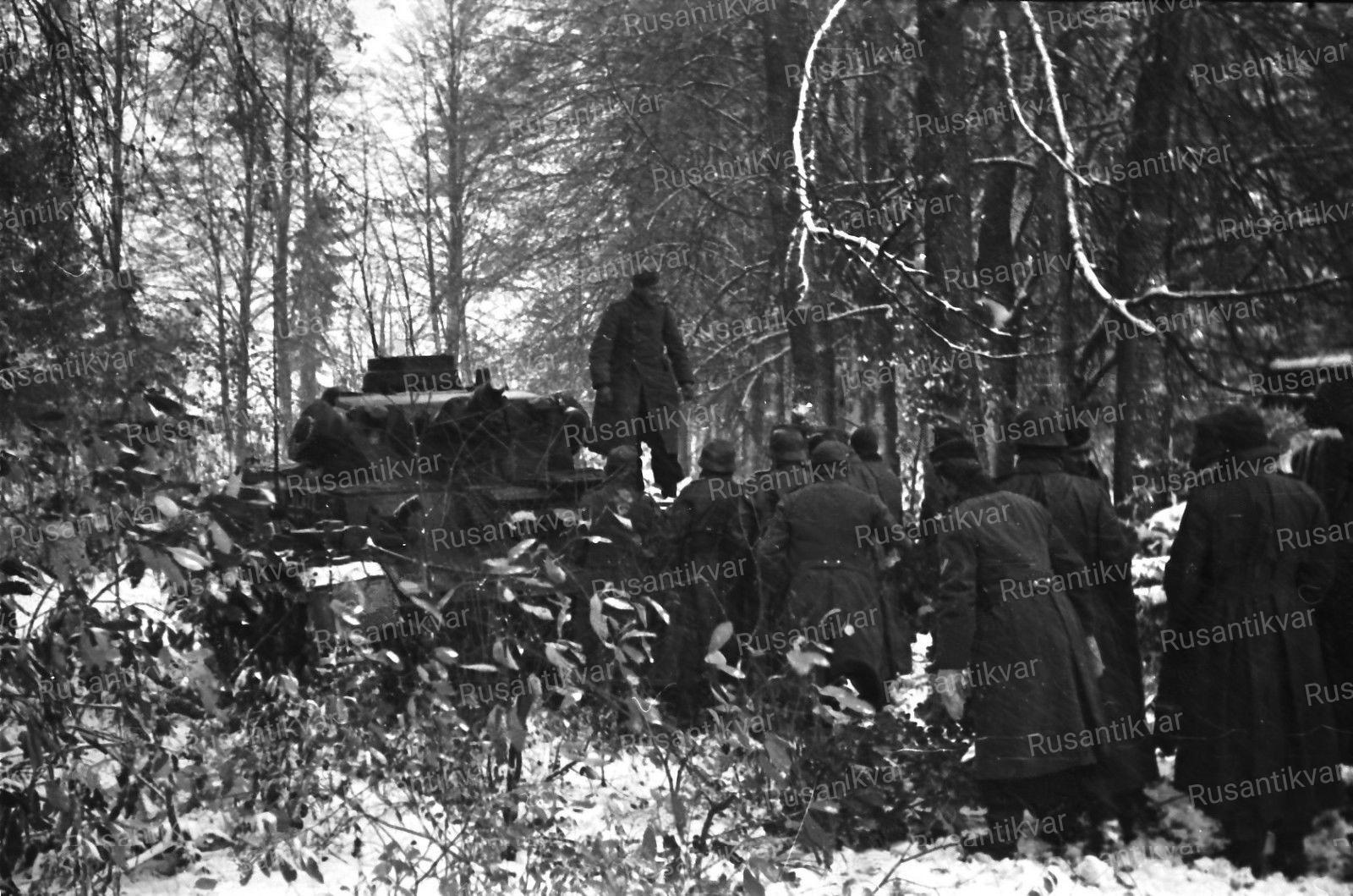 3. Можайск, первые числа ноября 1941 года. Немцы осматривают эвакуированный танк Т-III с фатальными повреждениями. На боку у танка тактический знак 5-й танковой дивизии.