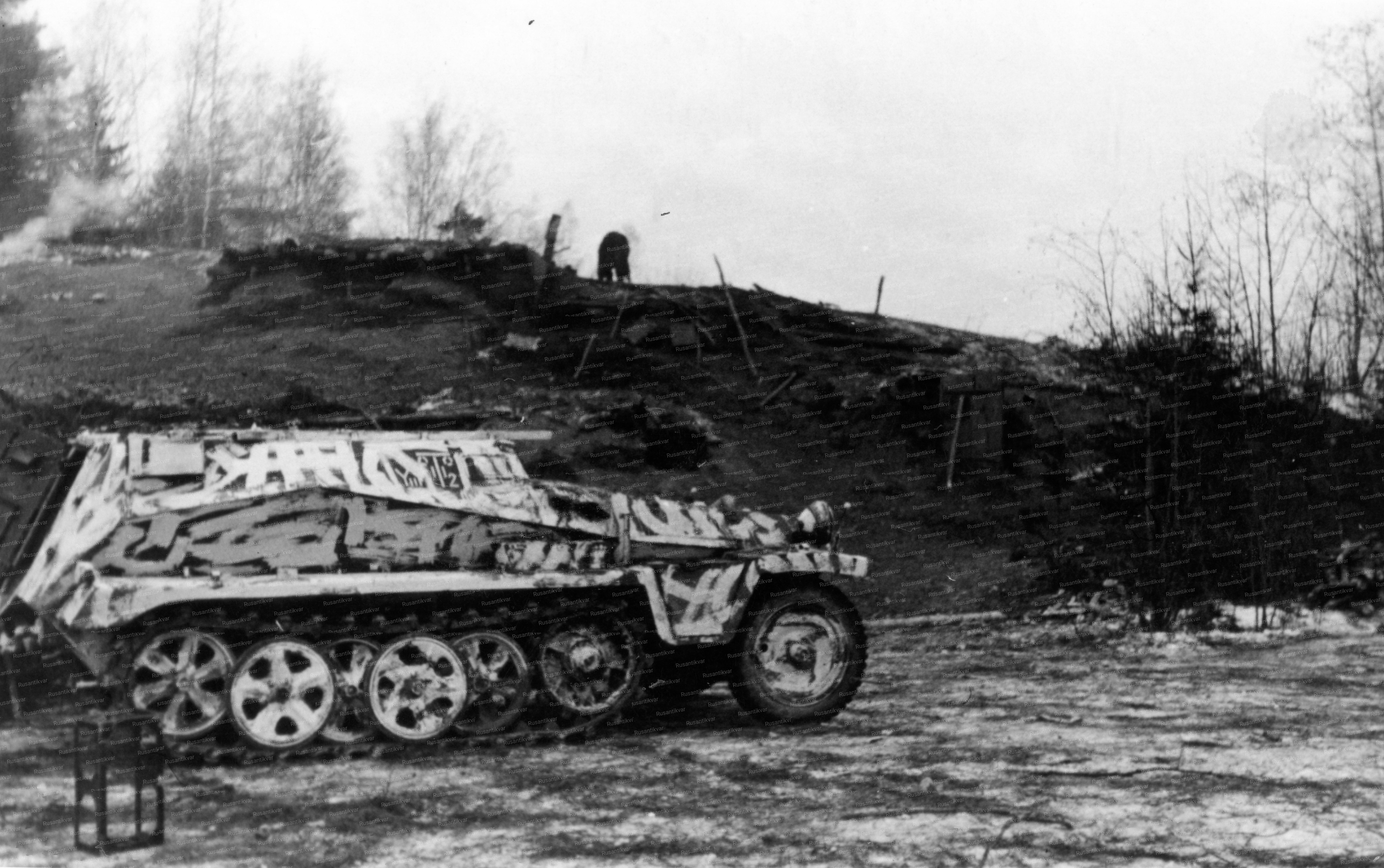 5. Германский полугусеничный бронетранспортёр у немецких блиндажей в деревне Скирманово. На броне виден тактический знак 10-й танковой дивизии.