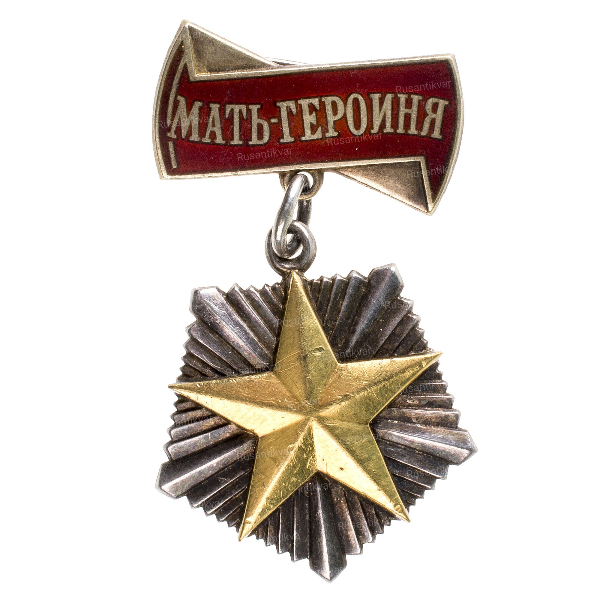 Орден «Мать-героиня» представляет собой золотую выпуклую пятиконечную звезду на фоне серебряных лучей, расходящихся в виде пятиконечной звезды, концы которой размещены между концами золотой звезды.