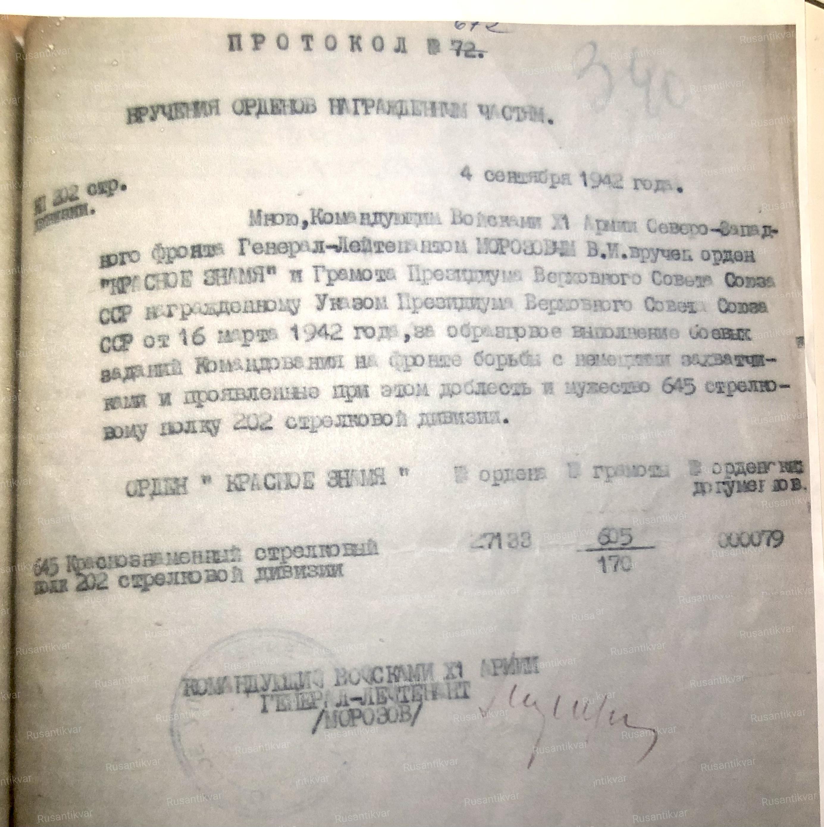 Наградной лист майора Натрошвили Семена Теодоровича. Документ о вручении ордена Красного Знамени 645-у стрелковому полку. Карта боевых действий Северо-Западного фронта.
