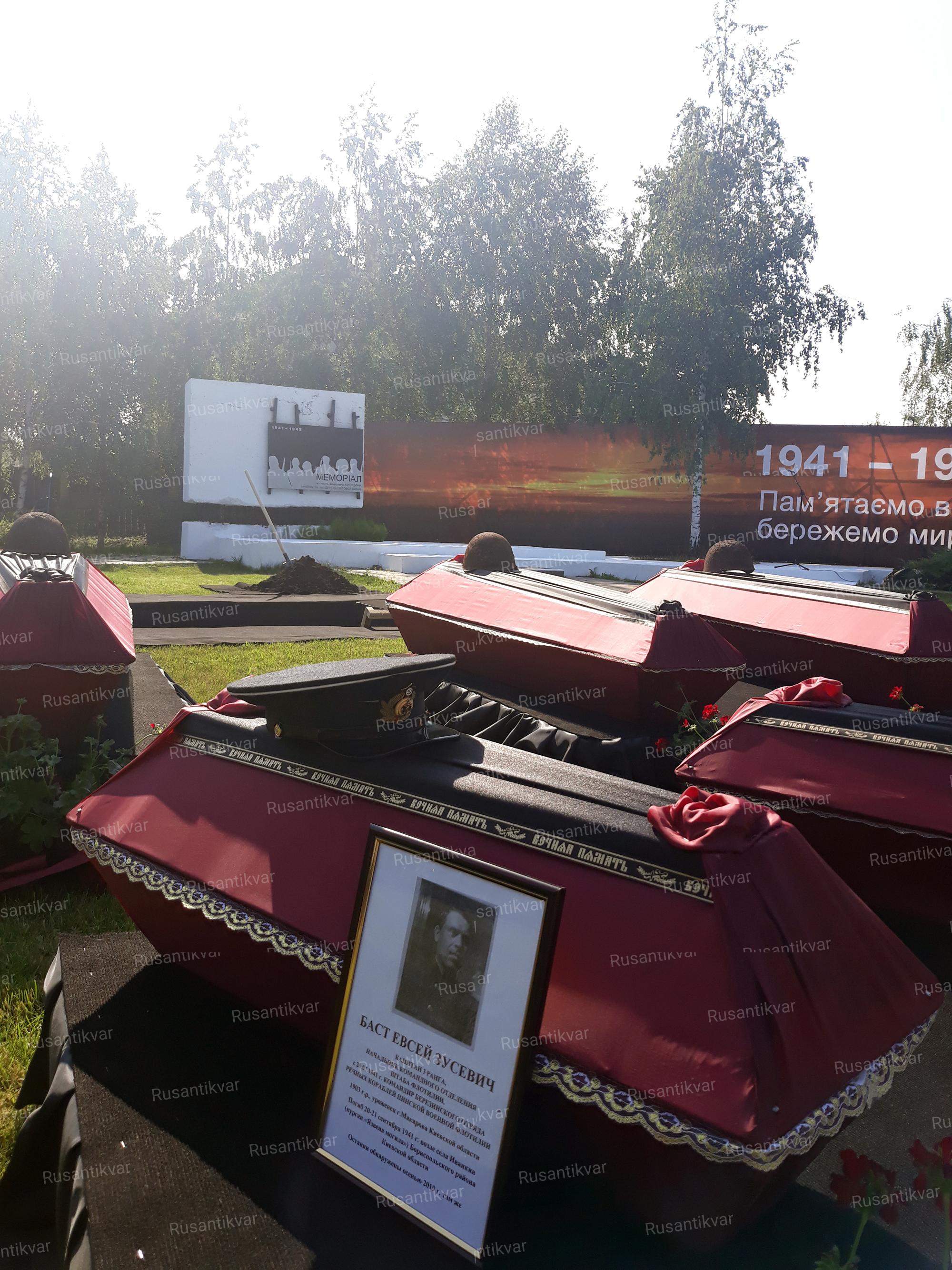 И вот этот день настал. 22 июня 2020 года, в День памяти и скорби, на военном мемориале в с. Гатное (Киевская область) было запланировано перезахоронение останков 22-х красноармейцев – защитников Киева в 1941-м году, среди которых удалось установить фамилию только лишь одного из них по медальону – Савенок Сергей Титович. Поскольку непосредственно поисковики АППО «Днепр-Украина» нашли останки командира и организация имеет отношение к этому вопросу, логичным решением было то, что капитан 3 ранга Пинской военной флотилии Баст Евсей Зусевич будет похоронен именно в этот день и на данном мемориале.
