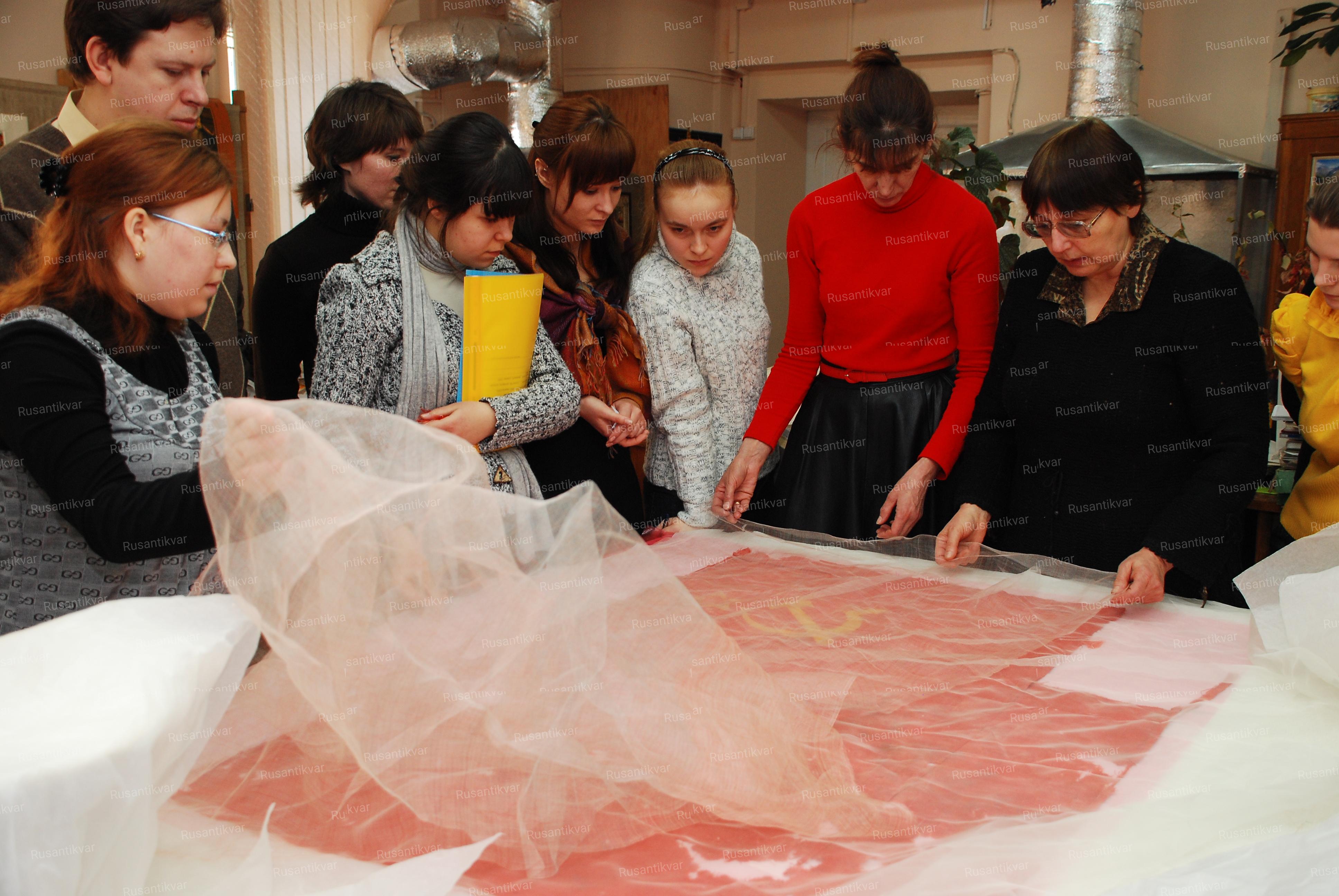 После проведения исследований флага в Суздальском художественно-реставрационном училище прошел реставрационный совет. На него специально приехала из Москвы заведующая отделом реставрации тканей Всероссийского художественного научно-реставрационного центра имени академика И.Э. Грабаря Елена Васильевна Семечкина, реставратор высшей категории. На реставрационном совете было решено провести окончательную очистку и обеззараживание ткани в стенах Всероссийского художественного научно-реставрационного центра, что и было сделано под руководством Е.В. Семечкиной.