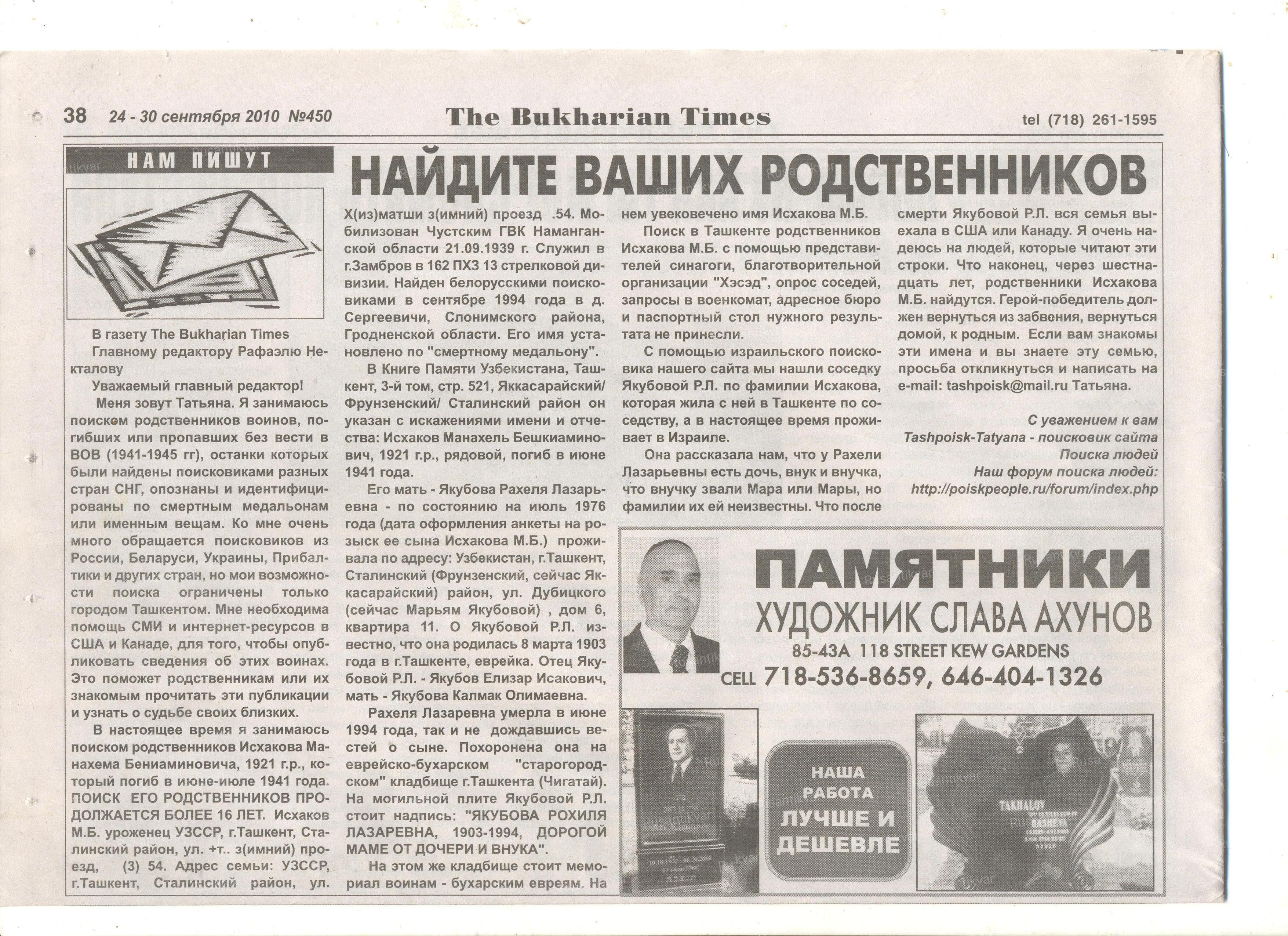 Обращения за помощью к еврейской общине в Ташкенте, представителям синагоги, благотворительной организации "Хэсэд", запросы в военкоматы, адресное бюро и паспортный стол, нужного результата не принесли. Были написаны более 100 писем Исхаковым и Якубовым на различных сайтах - социальных сетях. Люди отвечали, интересовались, но все это были лишь однофамильцы.