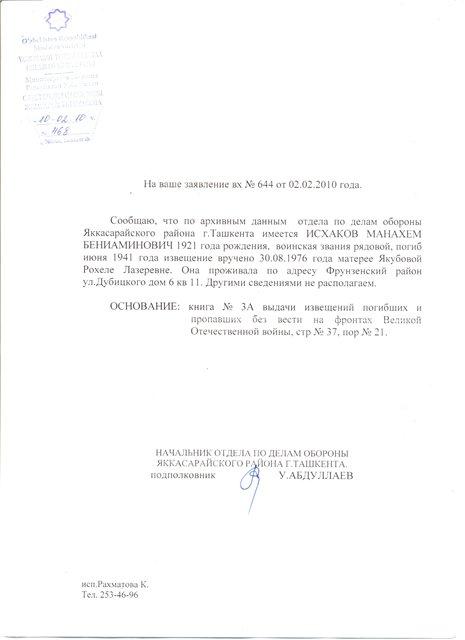 Ответ на запрос из Отдела по делам обороны Яккасарайского района г.Ташкента.