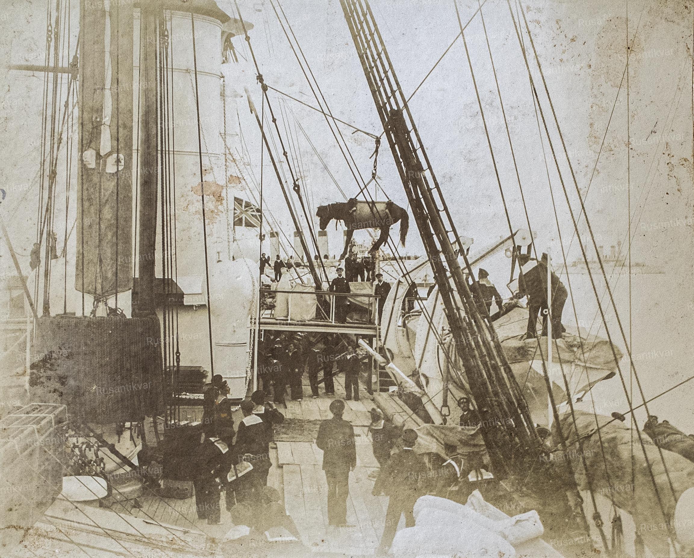 Новая страница из альбома. Фото датированное 1900 годом. Погрузка лошадей на крейсер. Второе фото из быта моряков. Команда моет белье.