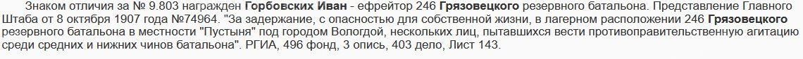 Знаком отличия за № 9.803 награжден Горбовских Иван - ефрейтор 246 Грязовецкого резервного батальона. Представление Главного Штаба от 8 октября 1907 года №74964. "За задержание, с опасностью для собственной жизни, в лагерном расположении 246 Грязовецкого резервного батальона в местности "Пустыня" под городом Вологдой, нескольких лиц, пытавшихся вести противоправительственную агитацию среди средних и нижних чинов батальона". РГИА, 496 фонд, 3 опись, 403 дело, Лист 143.