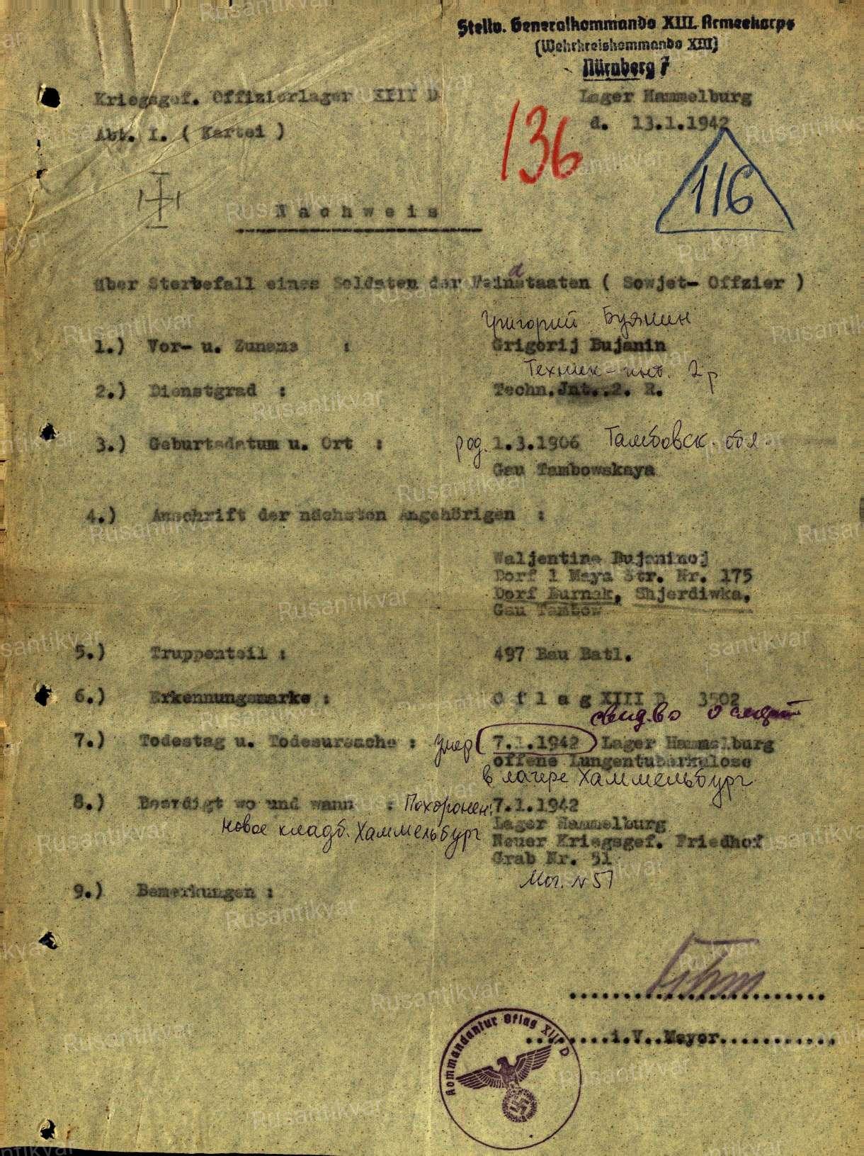 Рассмотрим первую из 17 страниц фамилий (Илл. 2). В первую очередь обращаем внимание на тех бойцов, у кого есть данные в колонке «Дата выбытия» - это значит, что человек погиб в плену, а не просто попал туда (хотя и здесь встречаются свои исключения). В данном конкретном случае это Буянин, Хаев, Сорокин, Боголюбский и Левстанов. Первый же из них – Буянин Григорий Карпович, - если проверить конкретно его через все тот же ОБД, в приказе об исключении из списков проходит как пропавший без вести (Илл. 3), а во втором томе Книги Памяти Тамбовской области присутствует с ошибкой в фамилии – Буяник – и тоже как пропавший без вести (Илл. 4). Чтоб обнаружить его в Книге Памяти, пришлось сформулировать запрос так: Григорий Карпович 1906. Если бы Григориев Карповичей 1906 года рождения оказалось слишком много, можно было добавить в поисковую строку место его рождения - тамбов* (звездочка обозначает поиск со свободным окончанием, т.е. ОБД выдаст вам как уроженцев г. Тамбова, так и Тамбовской области). В ходе работы обнаруживается, что в документах военнопленных Григорий Карпович Буянин проходит дважды – и в документах 52-го офлага и в документах офлага XIII D (62). Впрочем, обратившись к помощи Яндекса, обнаруживаем, что это одно и то же место - «Хаммельбург (1941 — 1945) — концентрационный лагерь на территории Германии, предназначенный для содержания пленных офицеров Красной Армии. Обозначение Oflag-XIII D (в дальнейшем после снятия карантина Oflag 62). Располагался на территории полигона Хаммельбург в Нижней Франкии к северу от Вюрцбурга». В любом случае, немецкий документ с пометками нашего переводчика дает однозначный ответ на вопрос о месте захоронения – новое кладбище Хаммельбург, могила 51 (Илл. 5). ИЛЛ 3,4,5