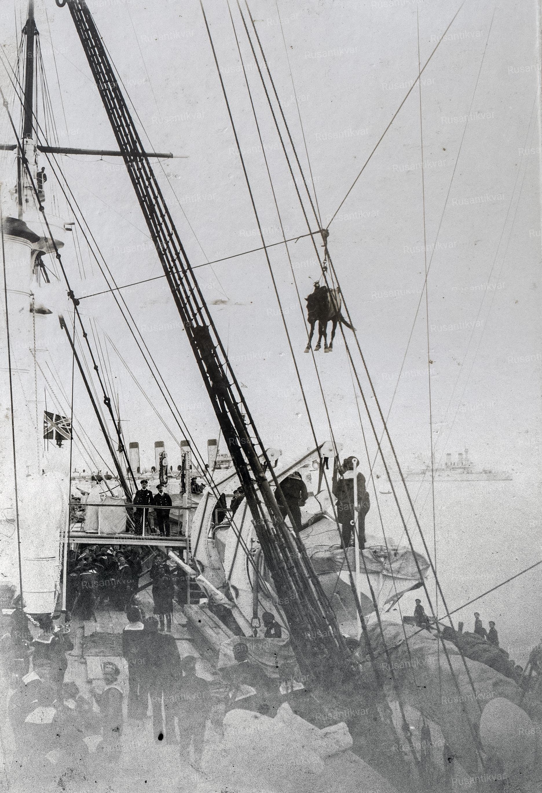 Новая страница из альбома. Фото датированное 1900 годом. Погрузка лошадей на крейсер. Второе фото из быта моряков. Команда моет белье.