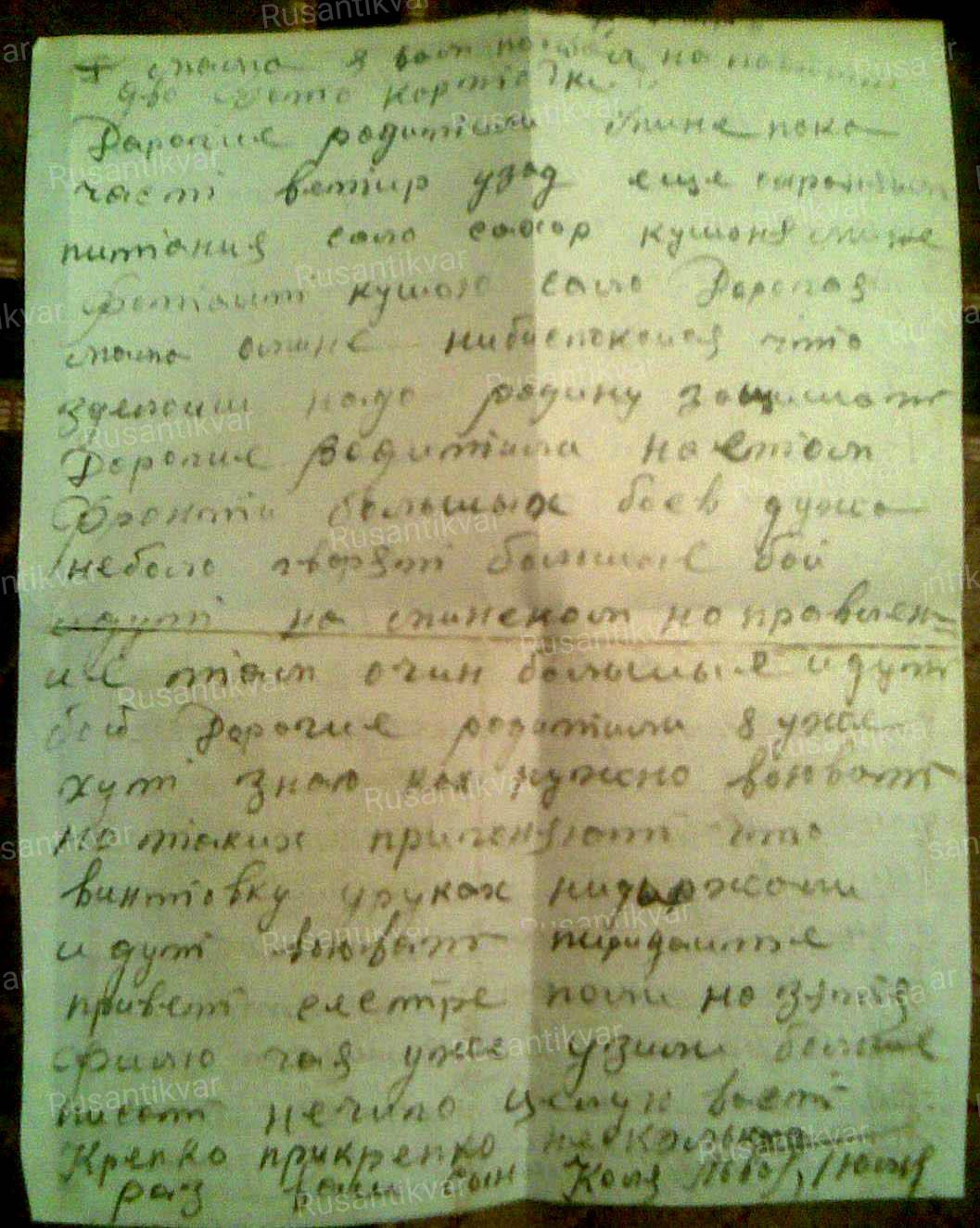 «1 июля пишу письмо с фронта. 1 июля 1941 года добрый день или вечер, здравствуйте дорогие родители. Здравствуй моя дорогая мама, сестра Александра Михайловна. В первых строках моего письма я вам спешу сообщить о том, что я ваше письмо получил, за которое я вам благодарен. Дорогая мама и сестра Александра Михайловна, когда я получил ваше письмо, то уже находился на службе в Каменец Подольске. Прошел учебку. Фронт находится от меня всего в 10 километрах. На данный момент охраняю склады с боеприпасами, так что пока серьезно не воевал. С питанием пока все нормально, едим сало, сахар, фрукты кушаем. Не беспокойся, что я здесь, ведь нам необходимо Родину защищать. Дорогие родители в стороне нашего фронта дуже сильных боев пока не было. Говорят большие и тяжелые бои идут на спинском направлении, там идут очень тяжелые бои. Дорогие родители здесь я уже знаю, как нужно воевать. Часто пригоняют таких, которые даже и не знают, как винтовку в руках надо держать, и сразу же идут воевать. Передавайте привет сестре, дяде Филе. Но вот и все, пока писать больше нечего. Целую вас крепко-прекрепко несколько раз. Ваш сын Коля Львов».