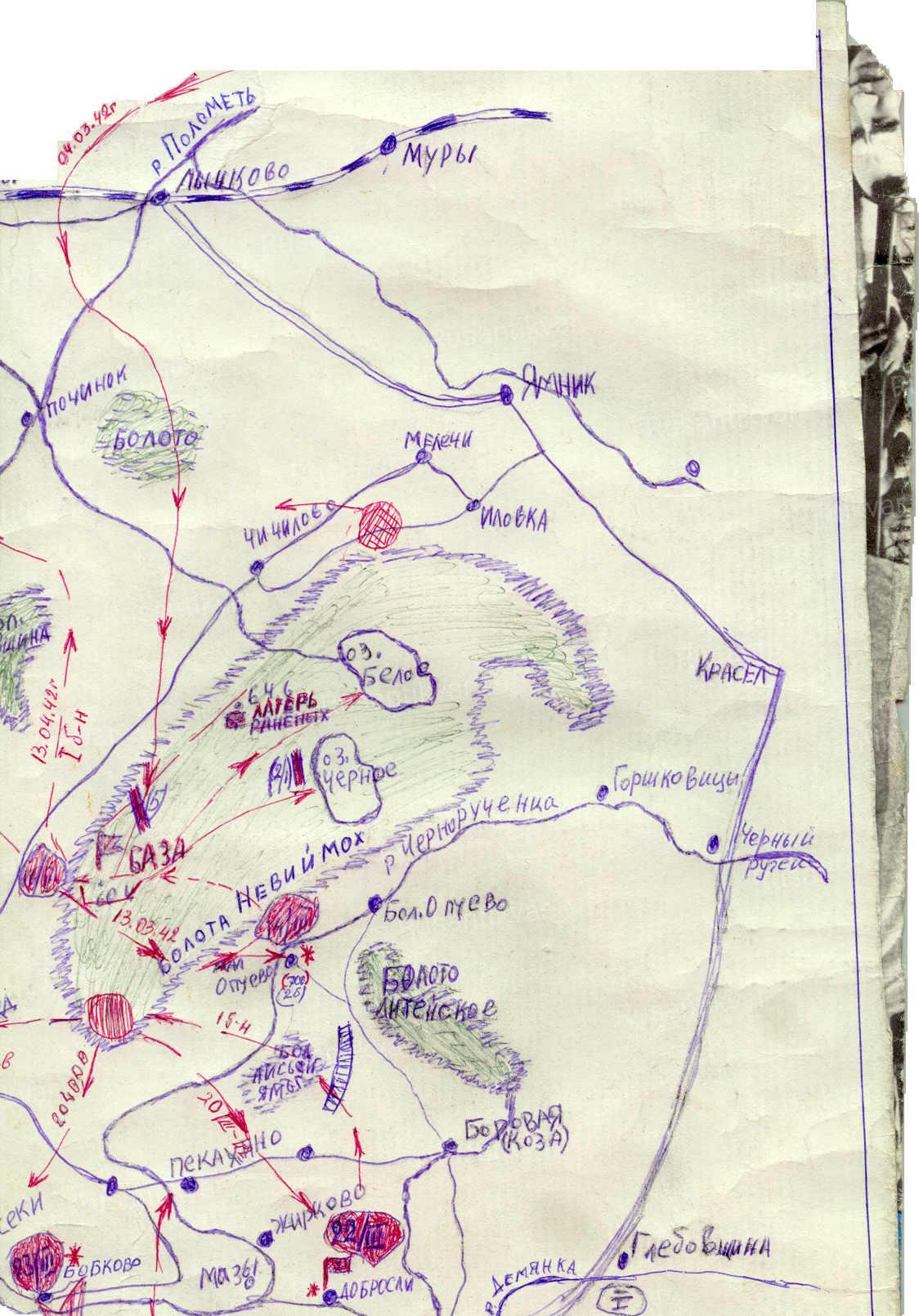 На этом месте поисковики наткнулись на большое количество брошенного снаряжения: СВТ, трехлинейки, каски, гранаты, мины, патроны и т.д; был даже найден авиаконтейнер, в котором сбрасывали оружие и боеприпасы с самолетов. Как в последствии выяснилось, это было действительно место сброса снаряжения и место стоянки 3 батальона 1 мвдбр. Но останков и тем более лагеря раненых здесь опять не было. Это окончательно выяснилось через неделю. После этого был произведен интенсивный марш в район Чичиловской дороги - отметки 64.6. Но и здесь нас ждало разочарование. Чичиловскую дорогу от болота отделяла какая-то пара сотен метров. Устраивать лагерь раненых в такой близи от важнейшей транспортной артерии немцев или обустраивать лагерь непосредственно на болоте, где он будет немедленно уничтожен авиацией, десантники вряд ли бы стали. Небольшая группа пыталась прочесать местность в районе озера Белое – безрезультатно. ФОТО 10,11.