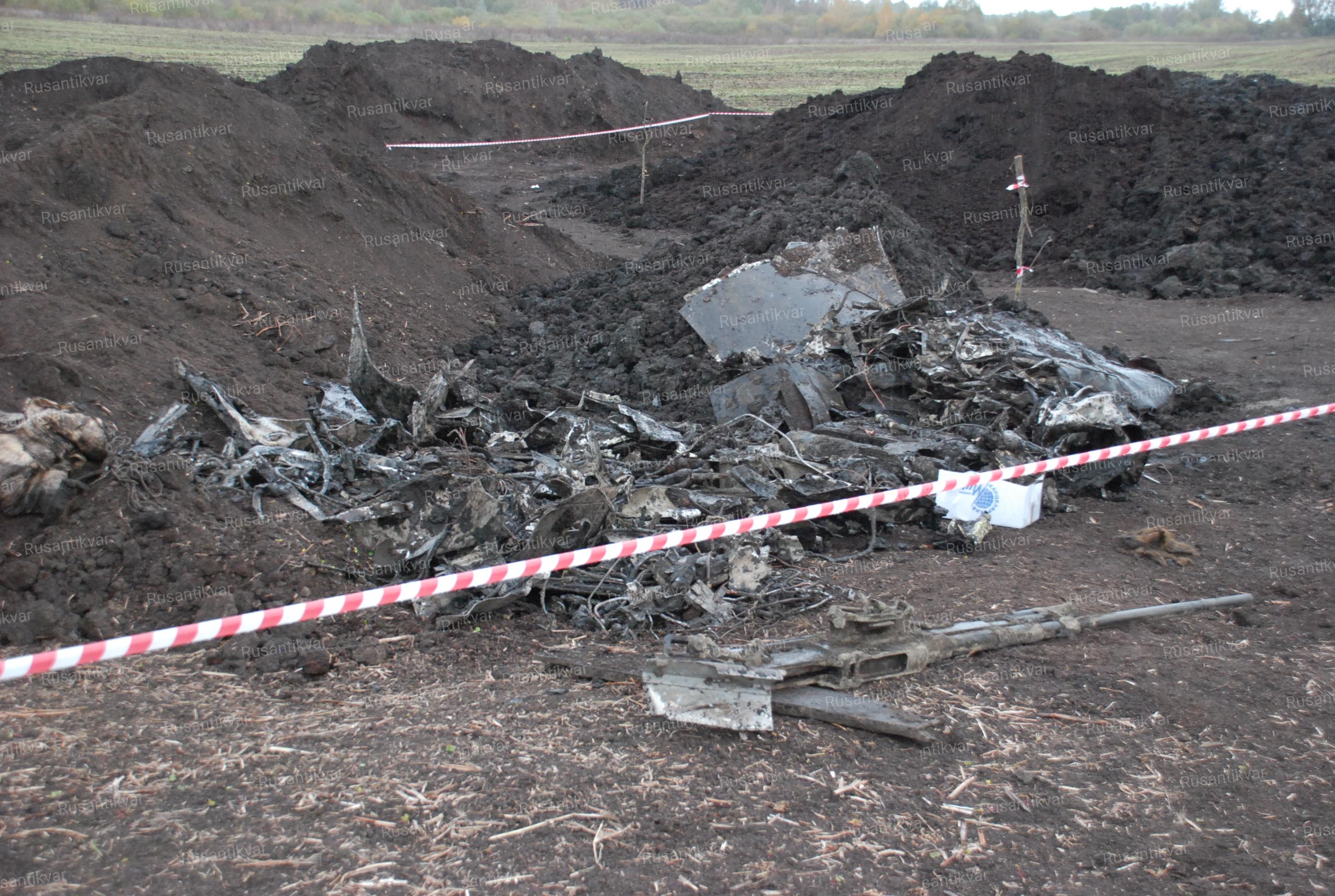 26 сентября работы были продолжены с помощью экскаватора. Вылет стрелы с ковшом в шесть с половиной метров обеспечивал надежное обнаружение обломков самолета. Шурфы пробивались на местах наибольшего скопления металла. Тщательно просматривались отвалы земли. Был задействован в работе, помимо металлодетекторов, сканер грунта (глубина обнаружения до шести метров). Но три дня работы к результату не привели. Из девяти вырытых ям, небольшие фрагменты самолета были обнаружены на глубине свыше трех метров только в двух ямах. 28-го сентября в десятой по счету яме на глубине трех – трех с половиной метров стали встречаться обломки самолета, лежащие в грунте достаточно плотно. А на глубине свыше пяти с половиной метров ковш экскаватора наткнулся на двигатель самолета с редуктором и воздушным винтом.